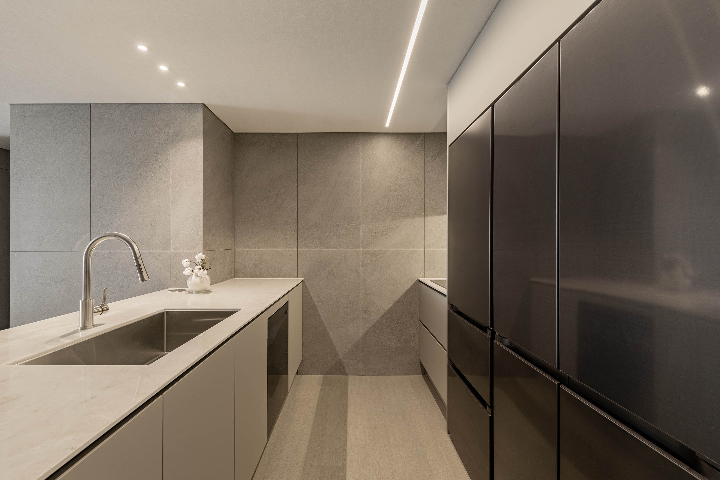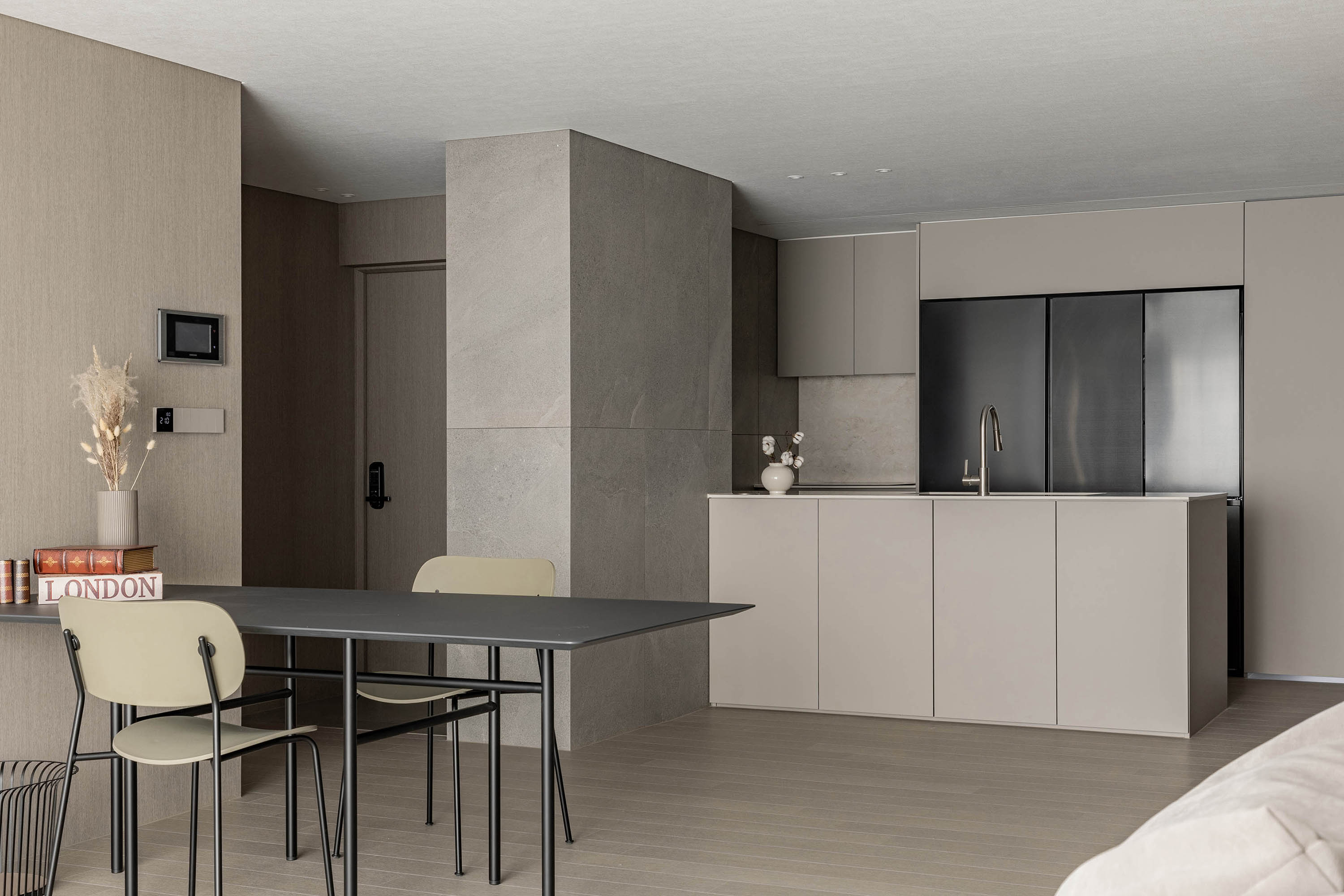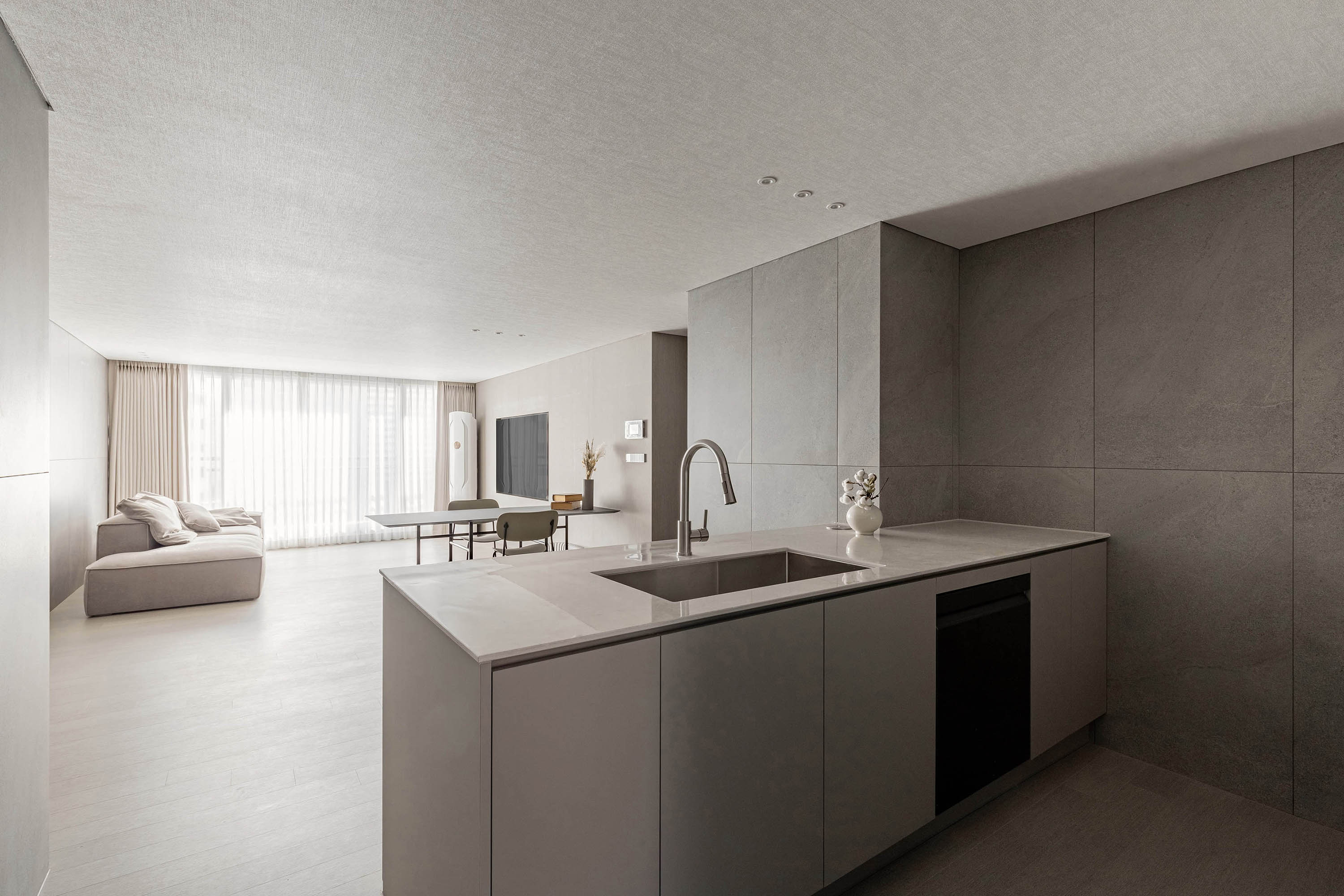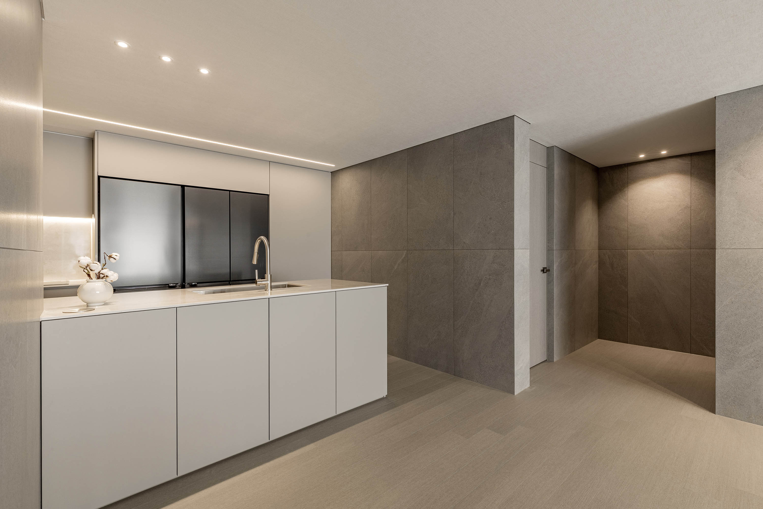 대면형 주방 레이아웃과 필름,타일,마루 인쇼스타일 인테리어