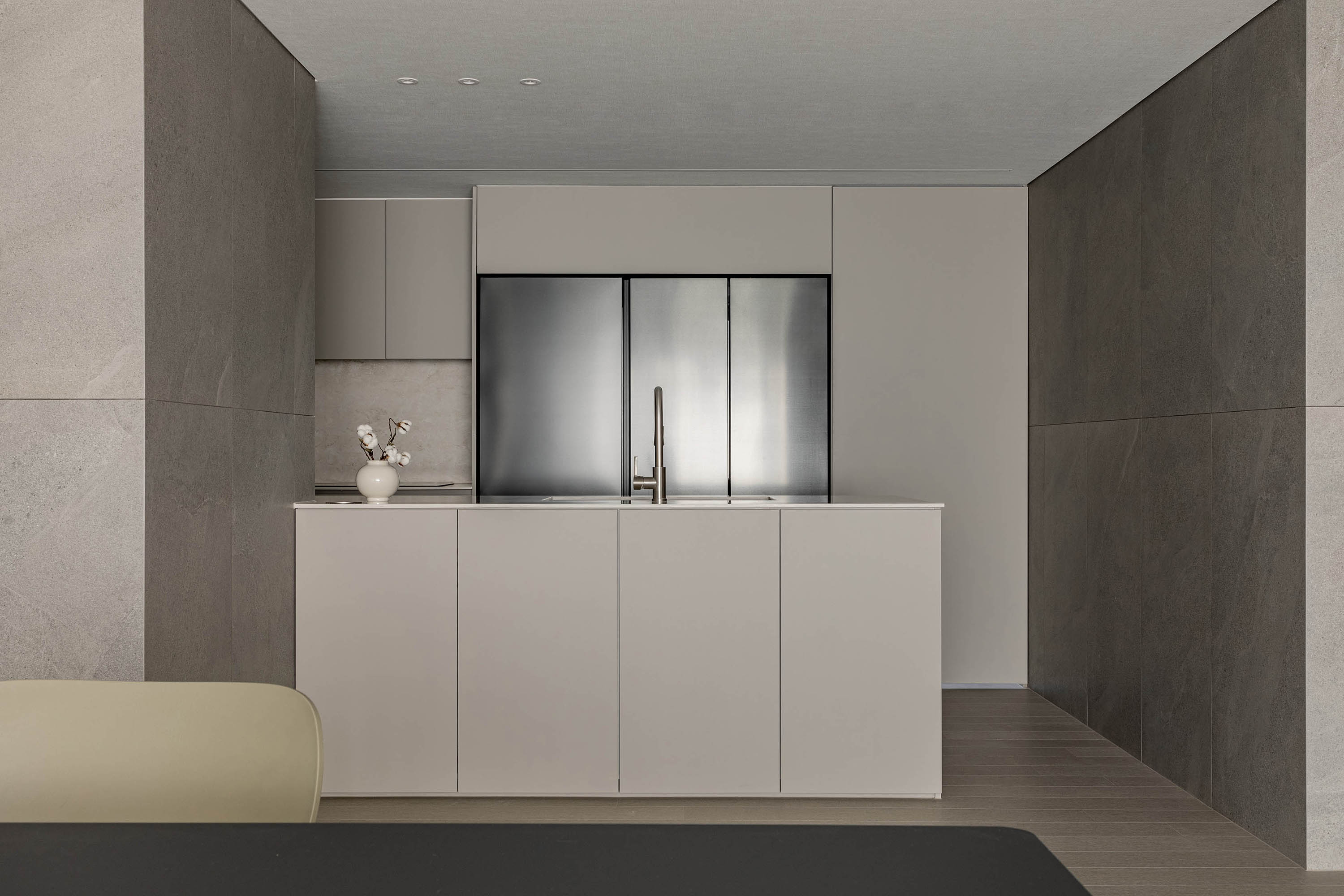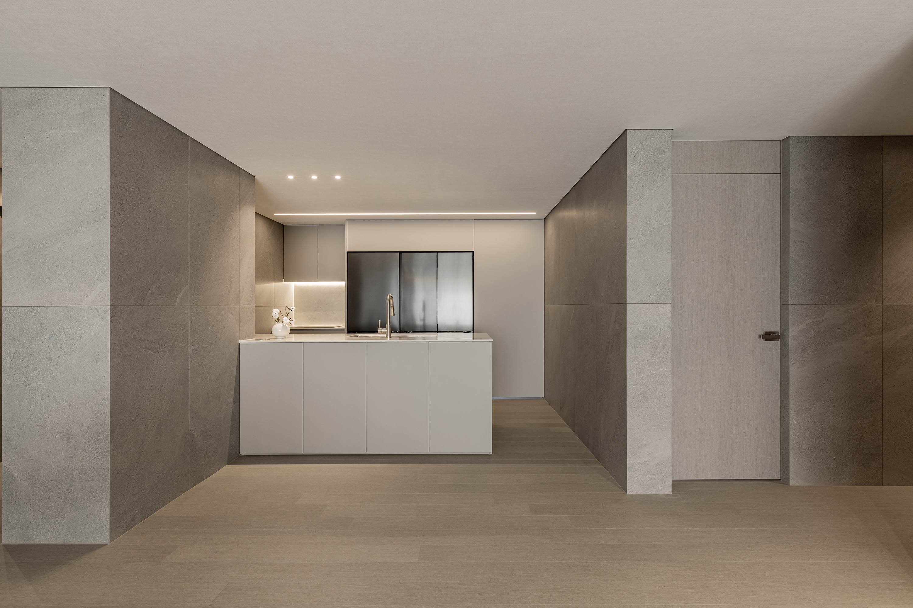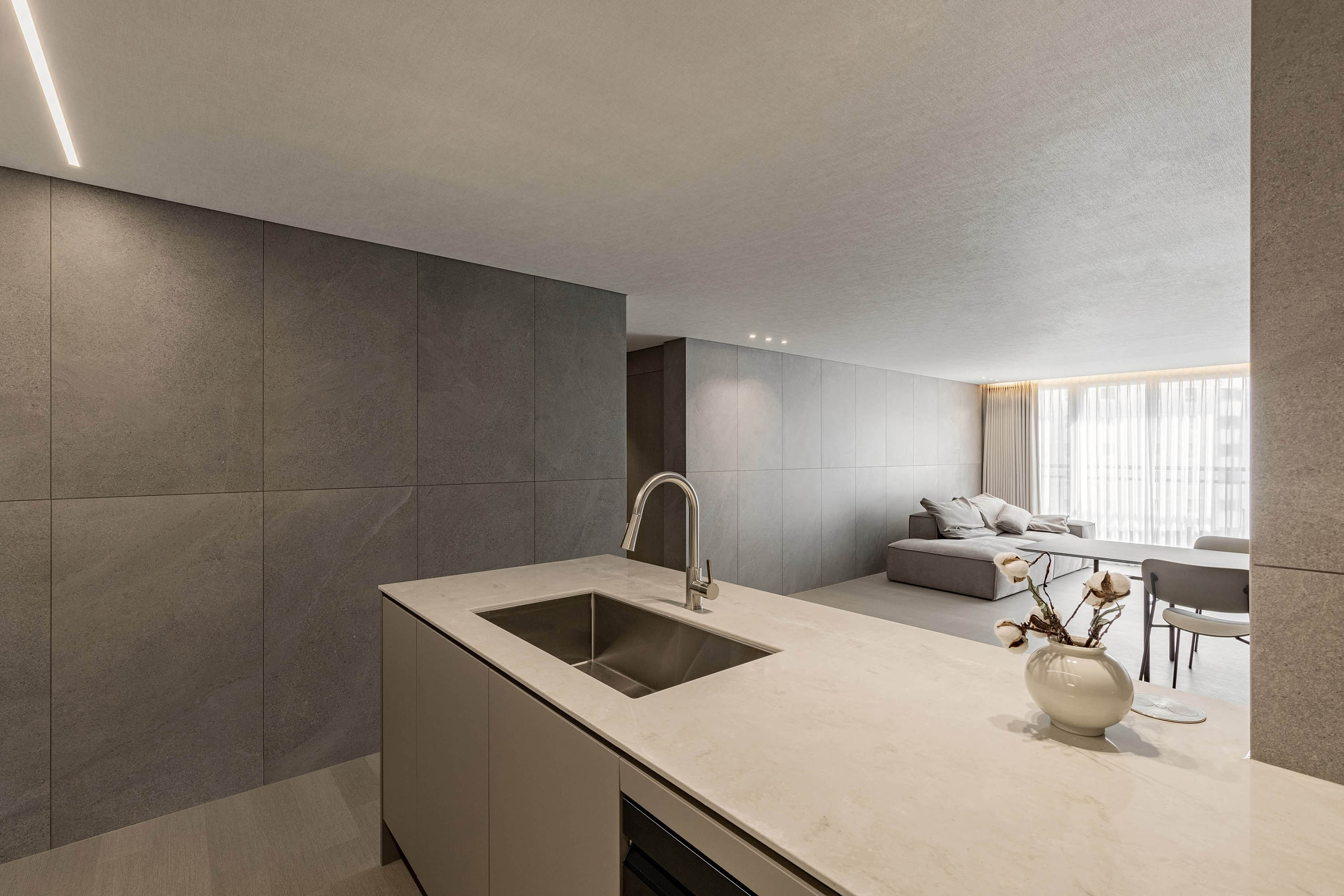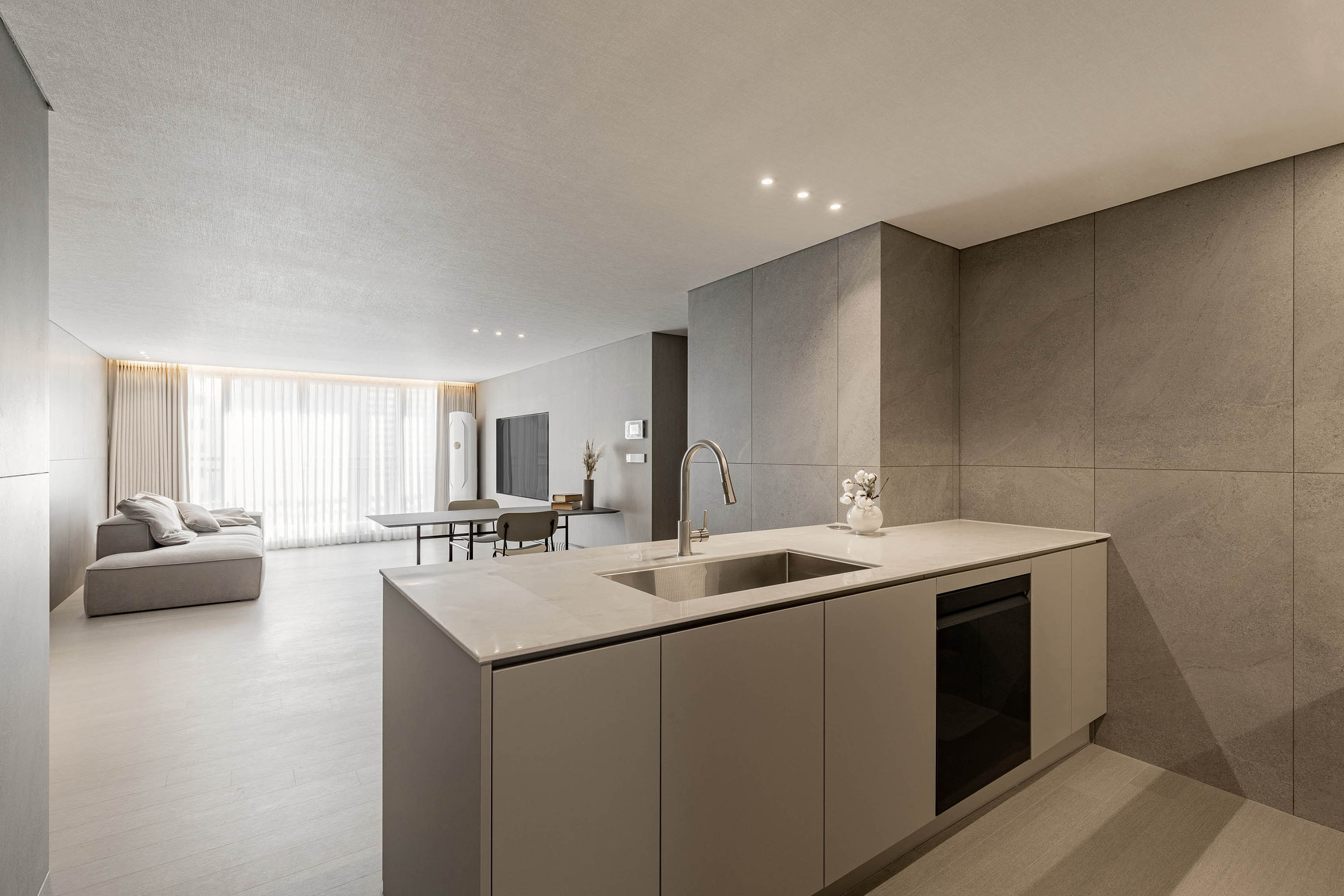 대면형 주방 레이아웃과 필름,타일,마루 인쇼스타일 인테리어