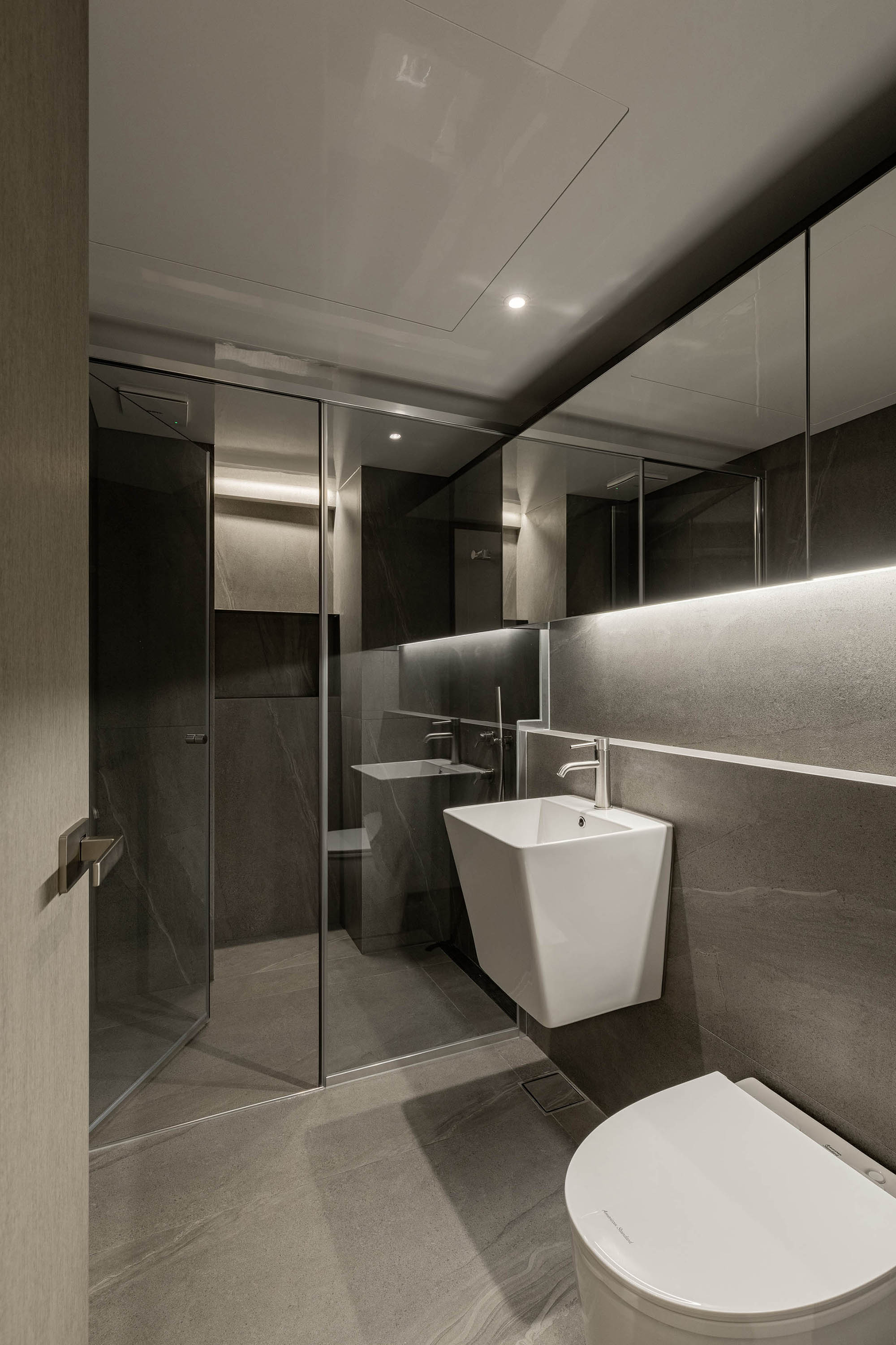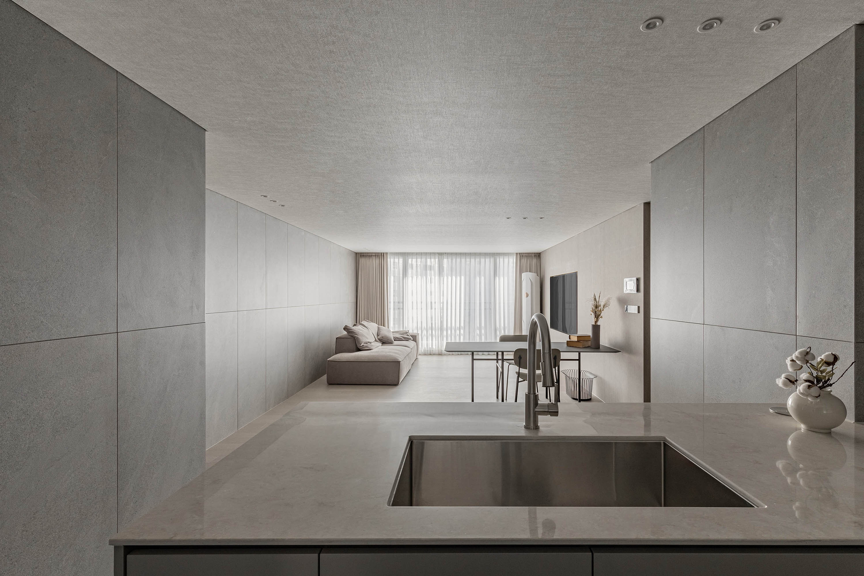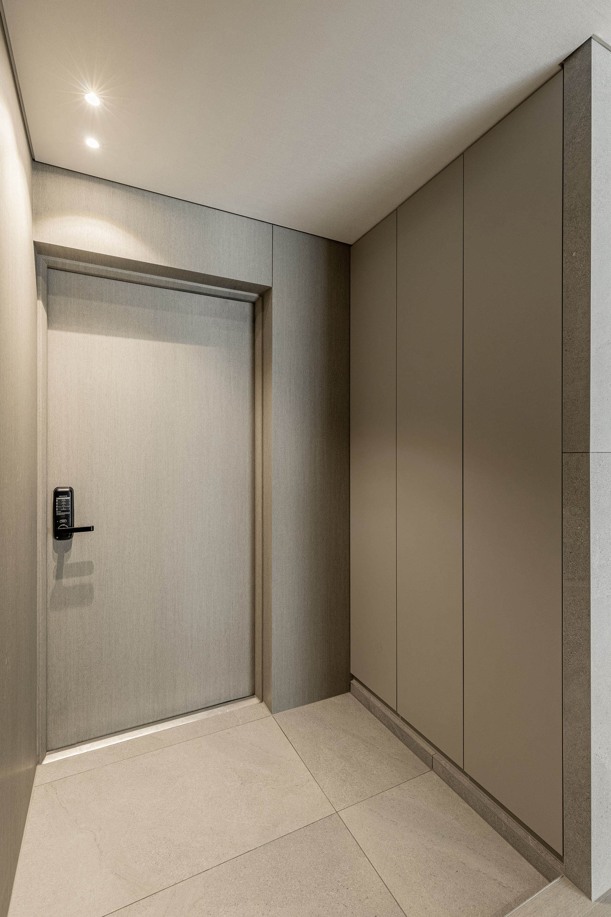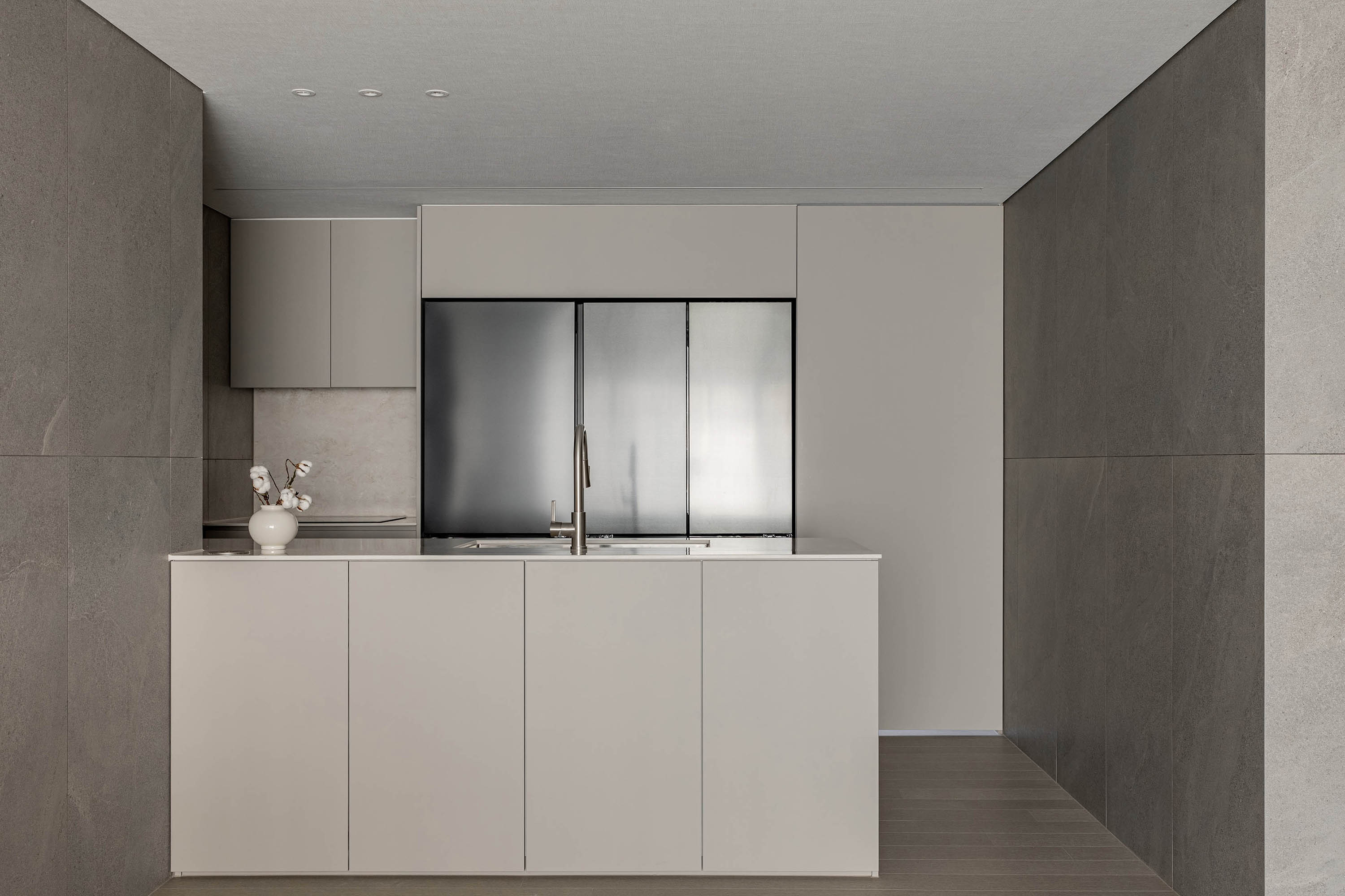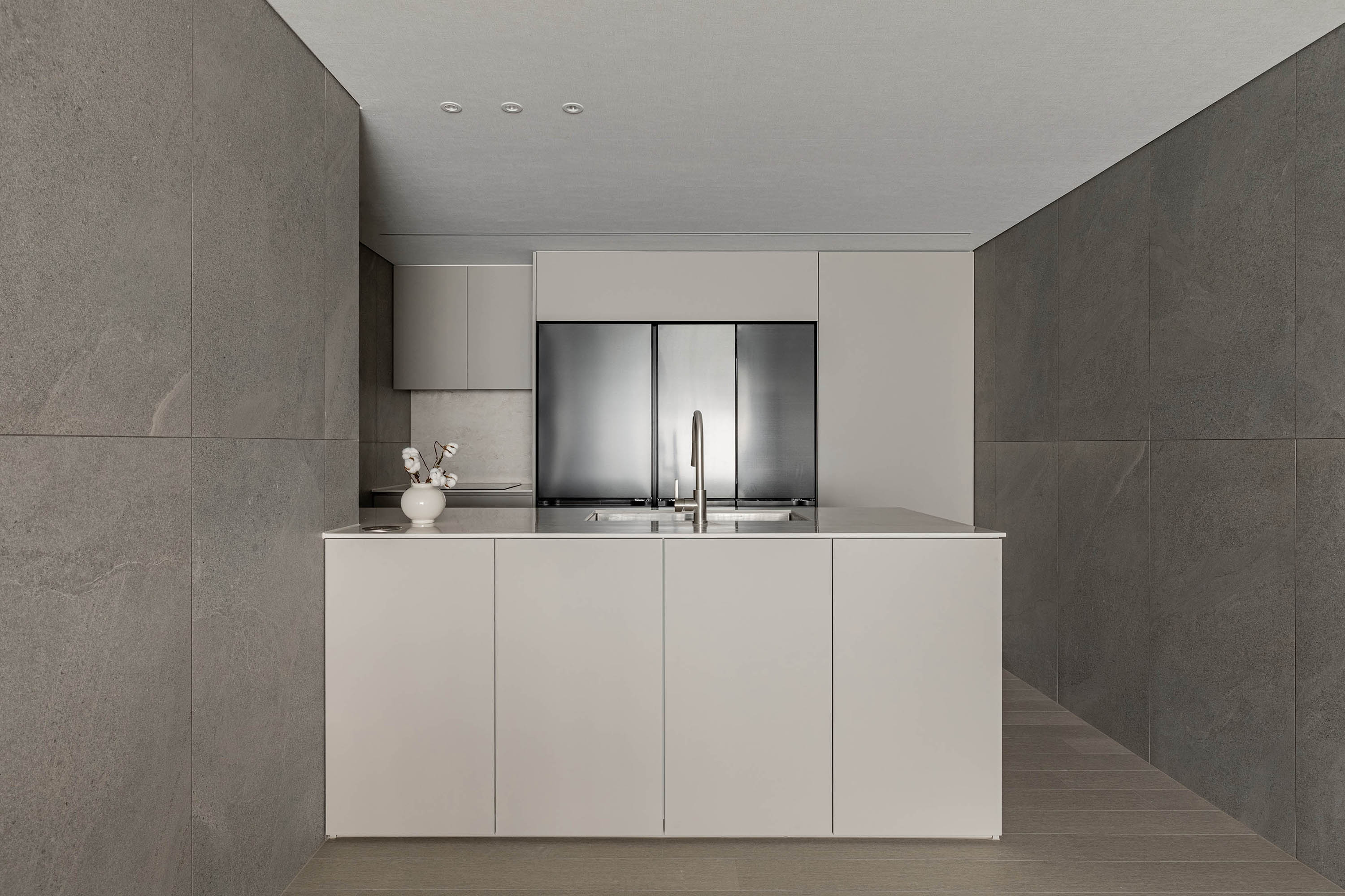 대면형 주방 레이아웃과 필름,타일,마루 인쇼스타일 인테리어