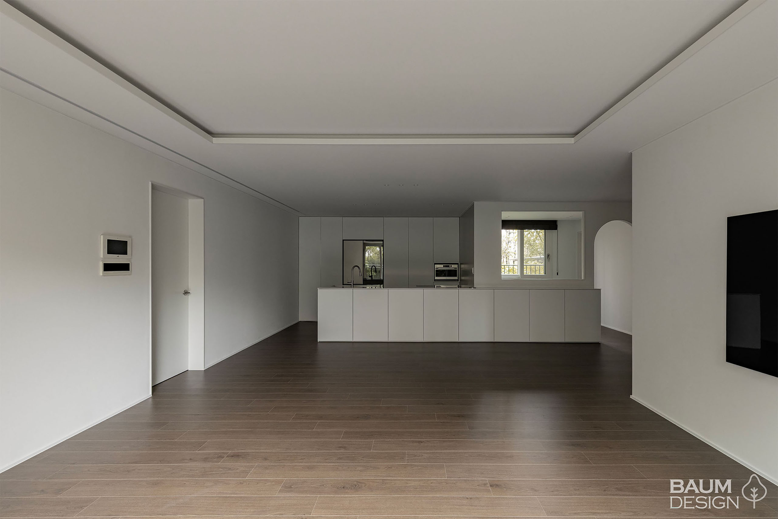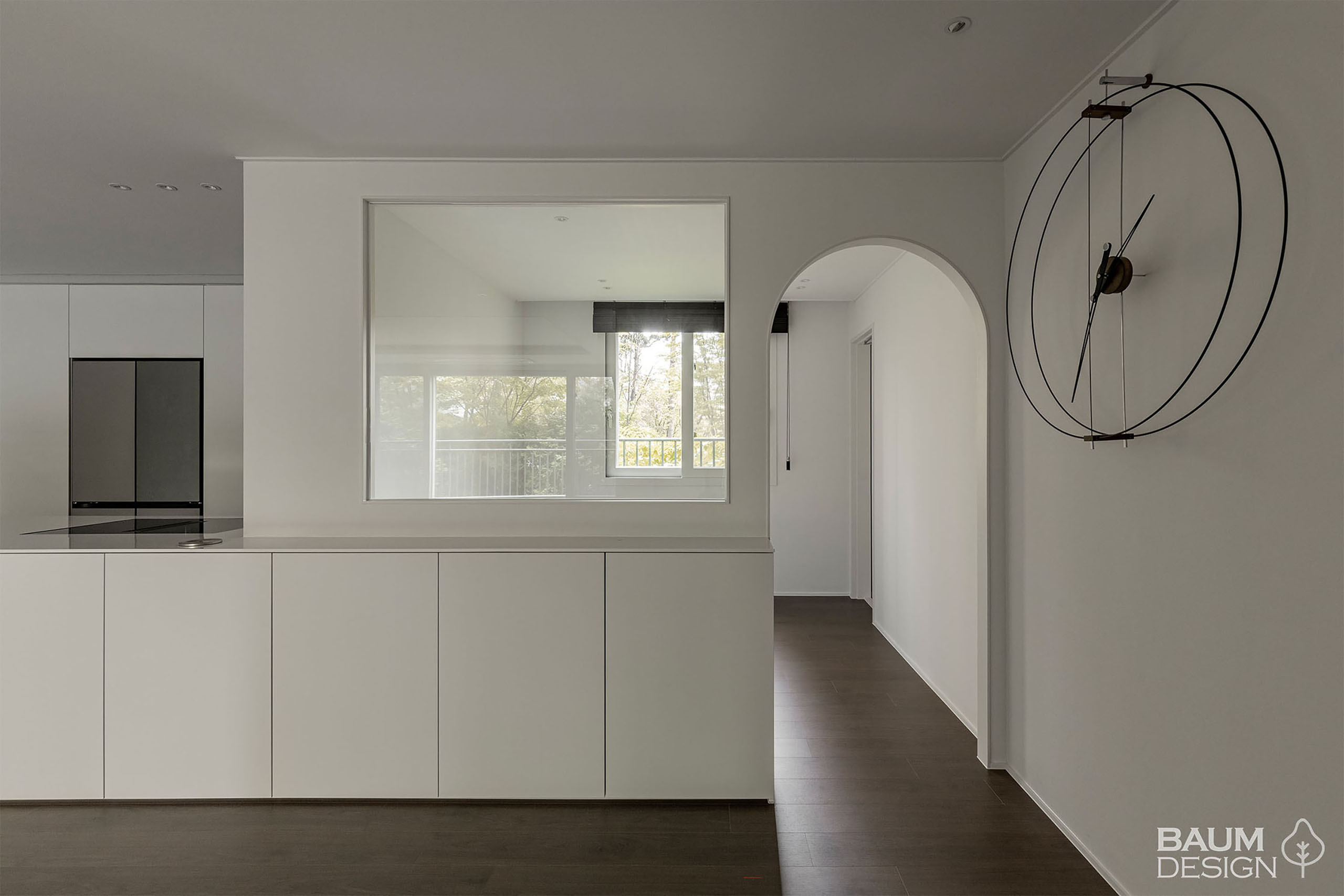 화이트 톤의 마감과 어두운 톤의 우드 마루가 잘 어우러진 인테리어