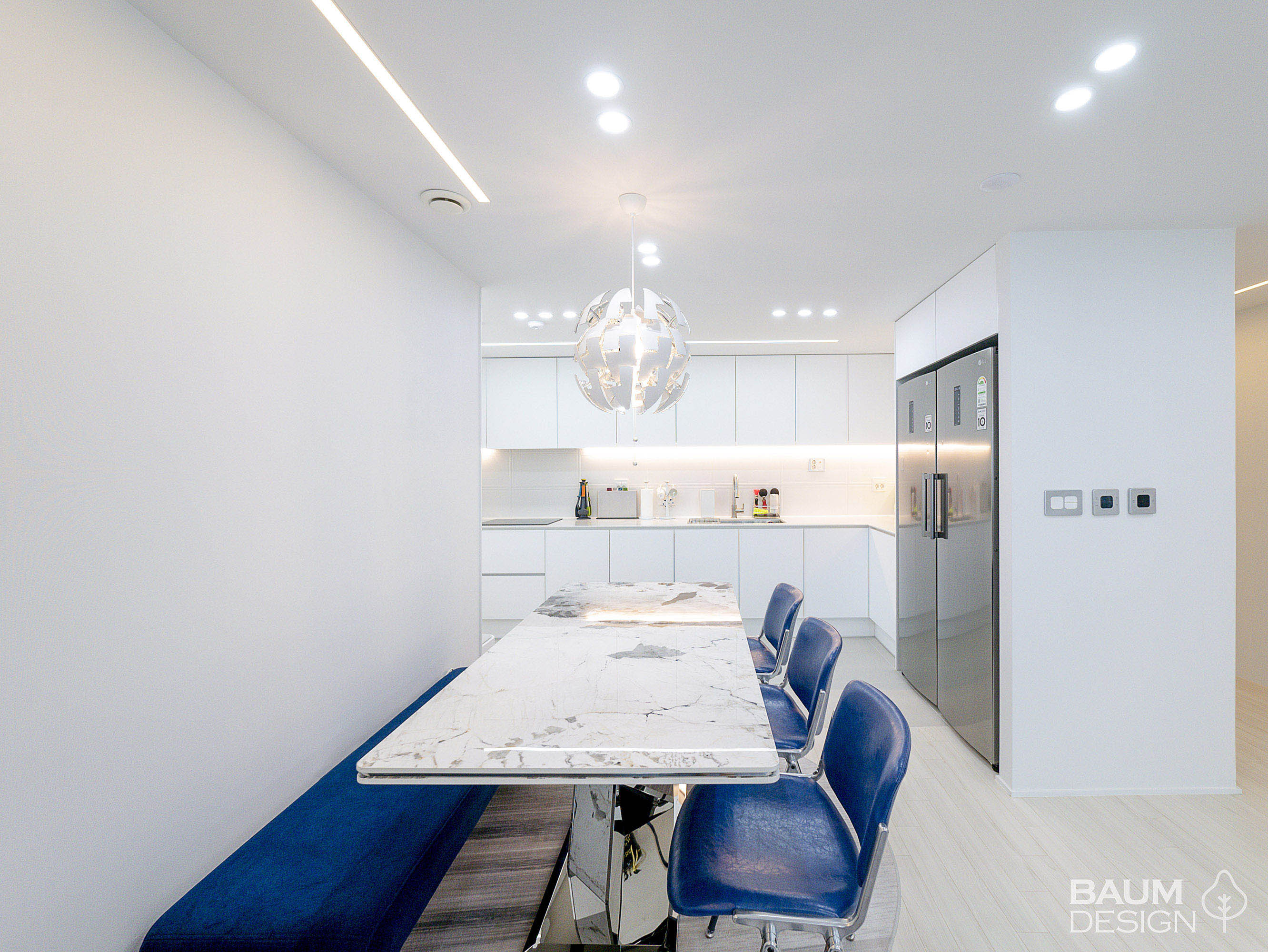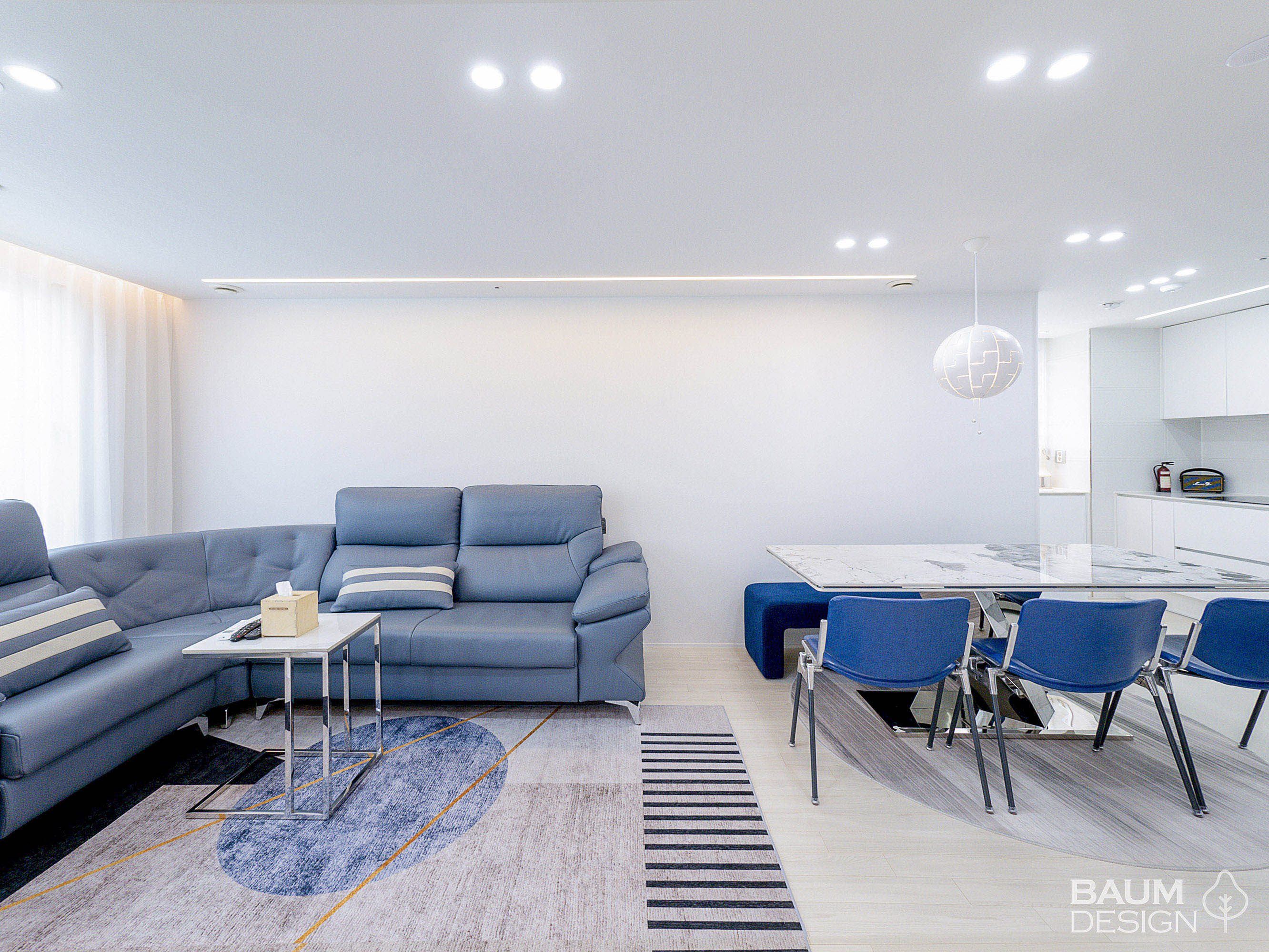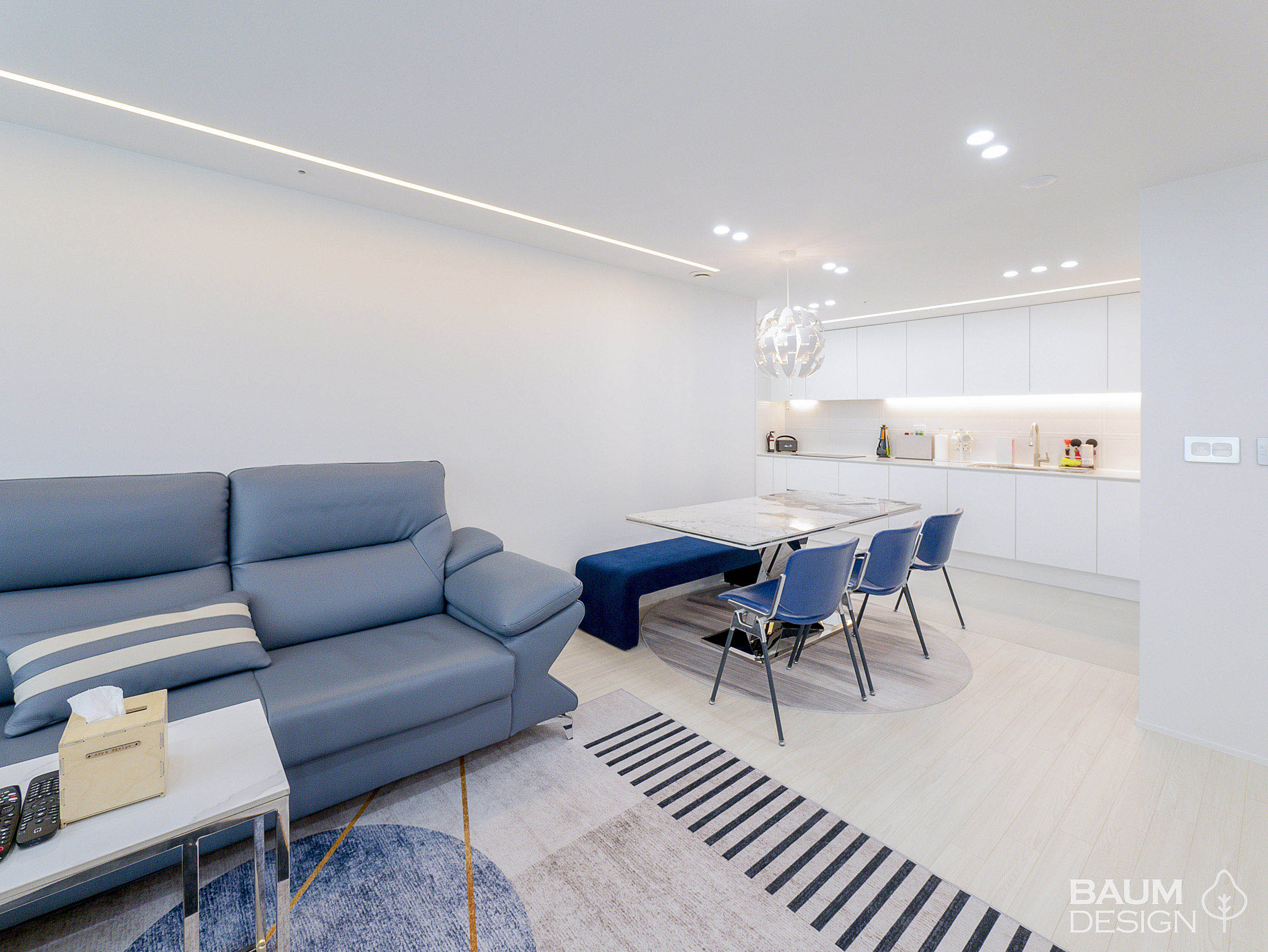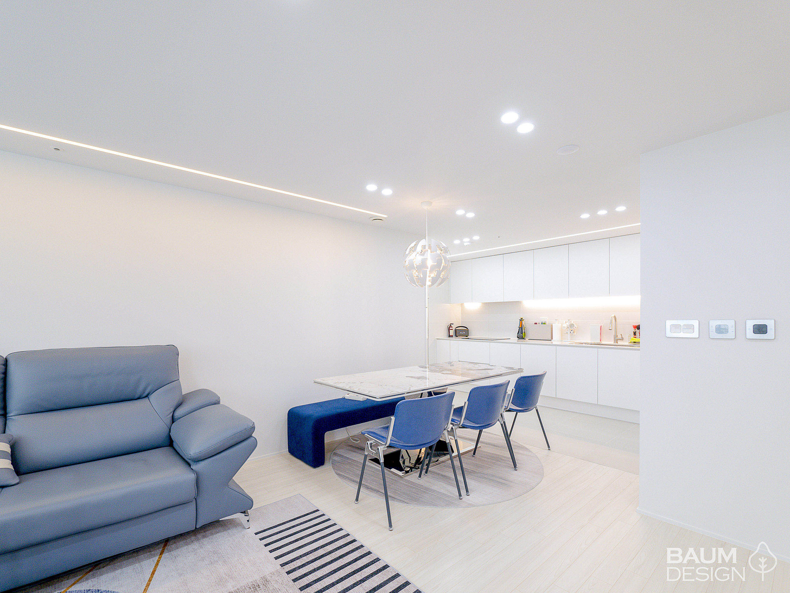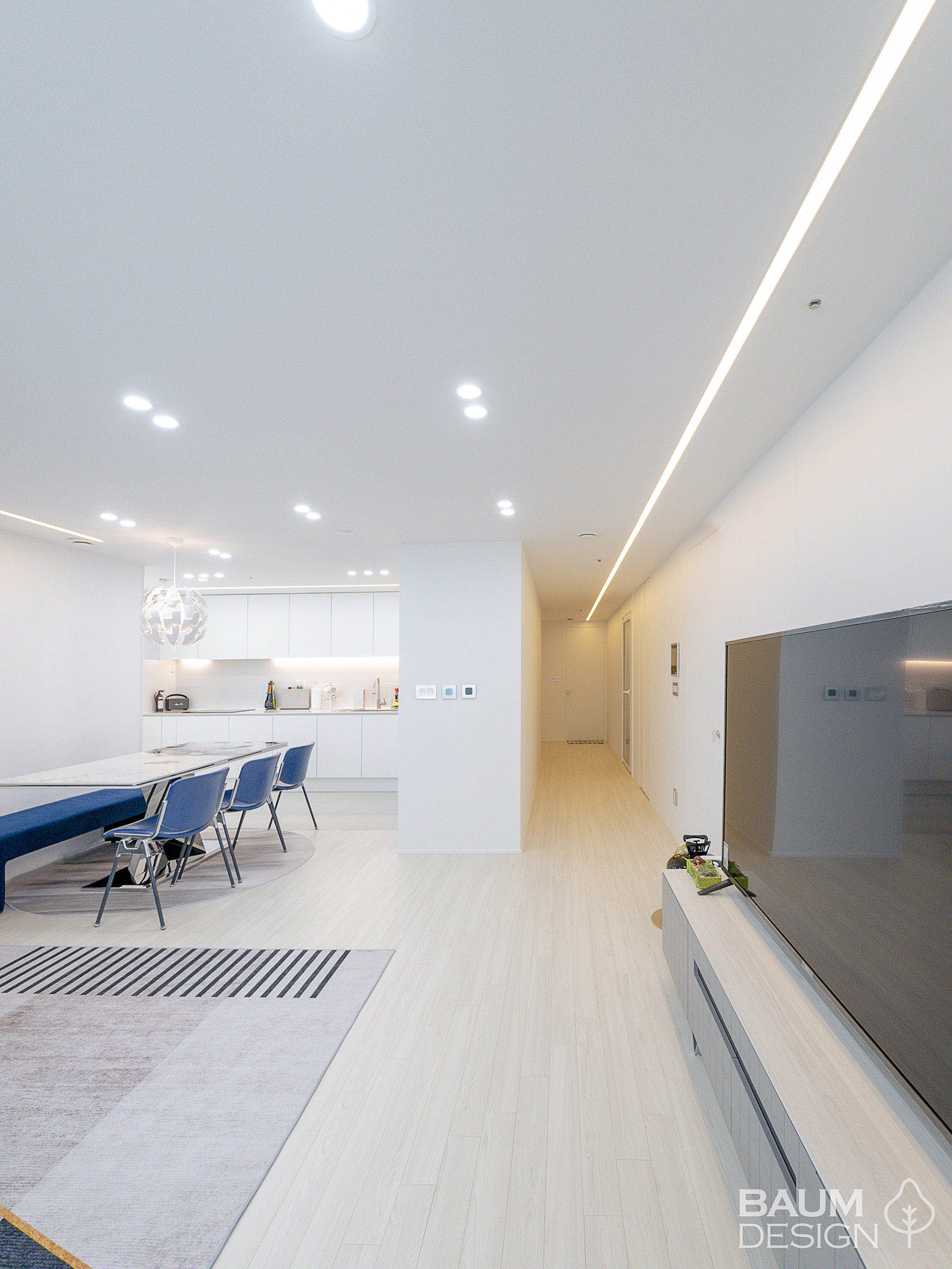 화이트에 블루로 포인트를 준 시원한 무몰딩, 히든도어, 라인조명 인테리어