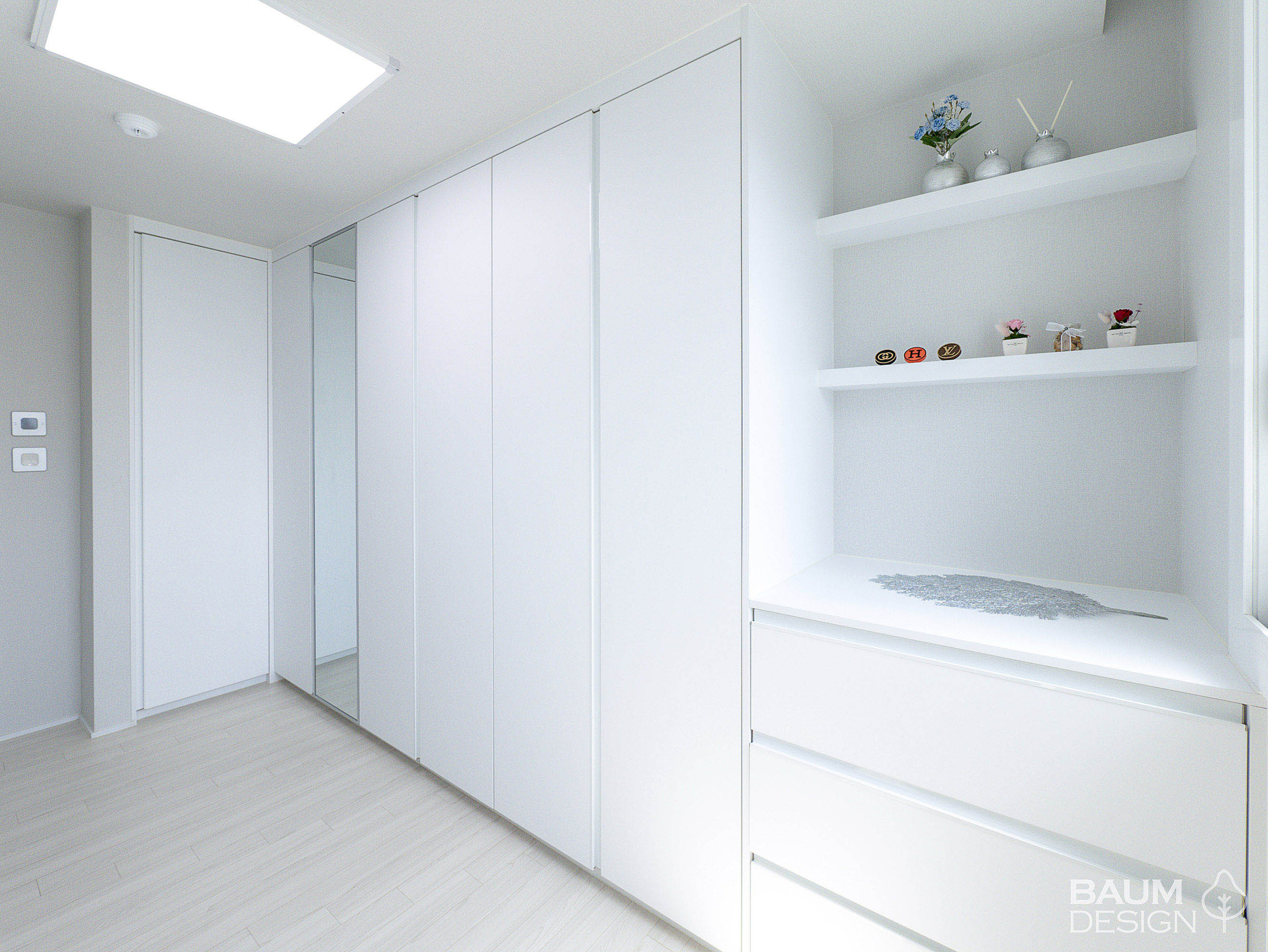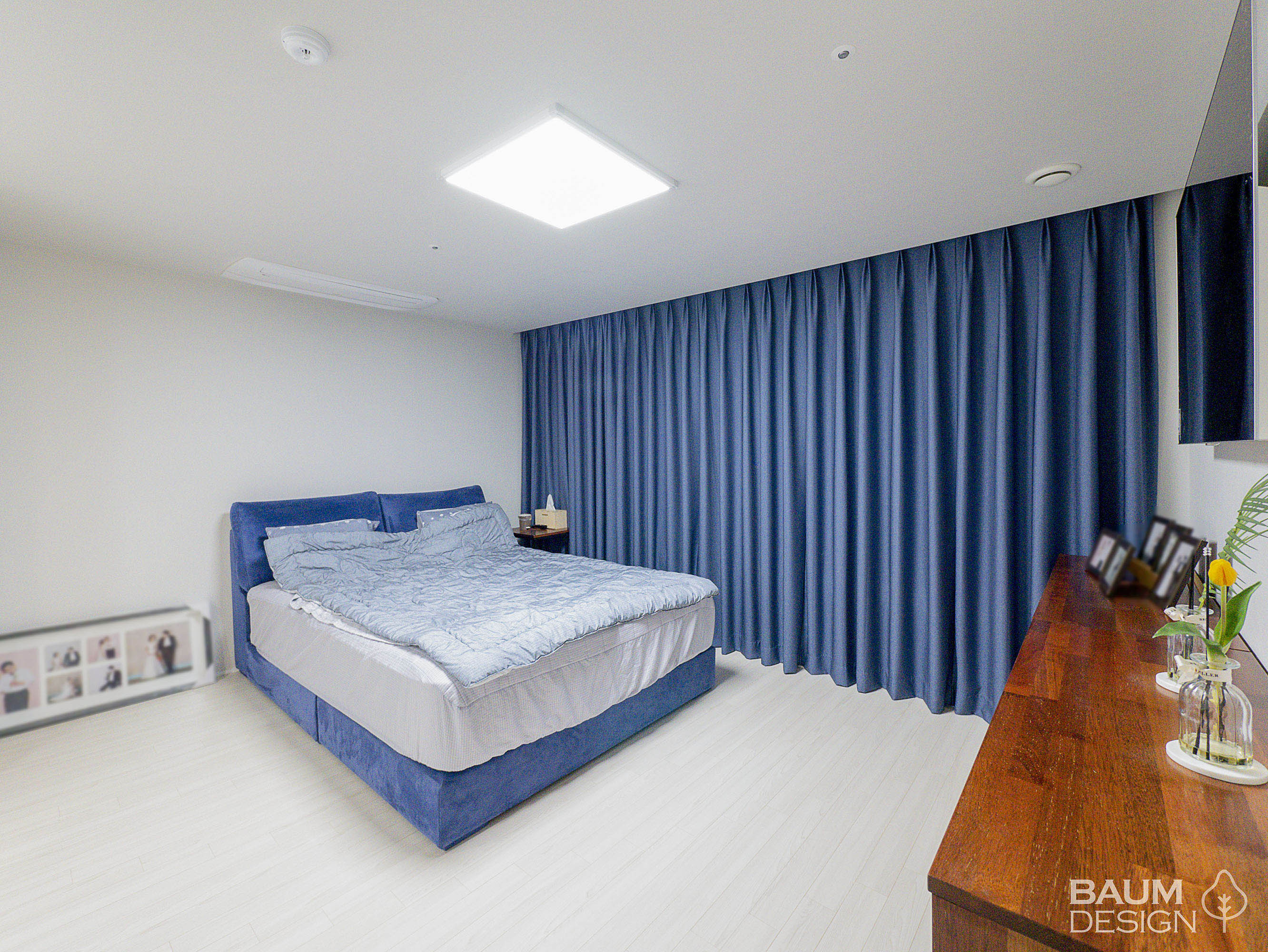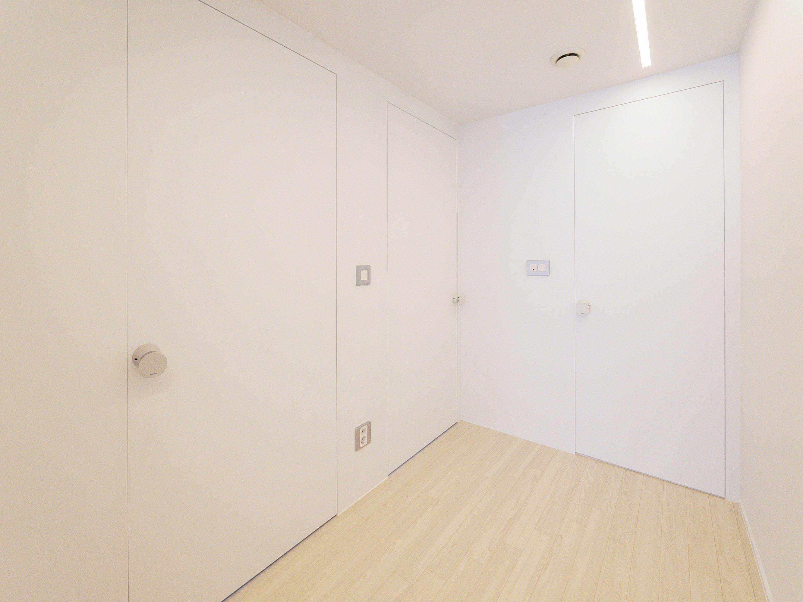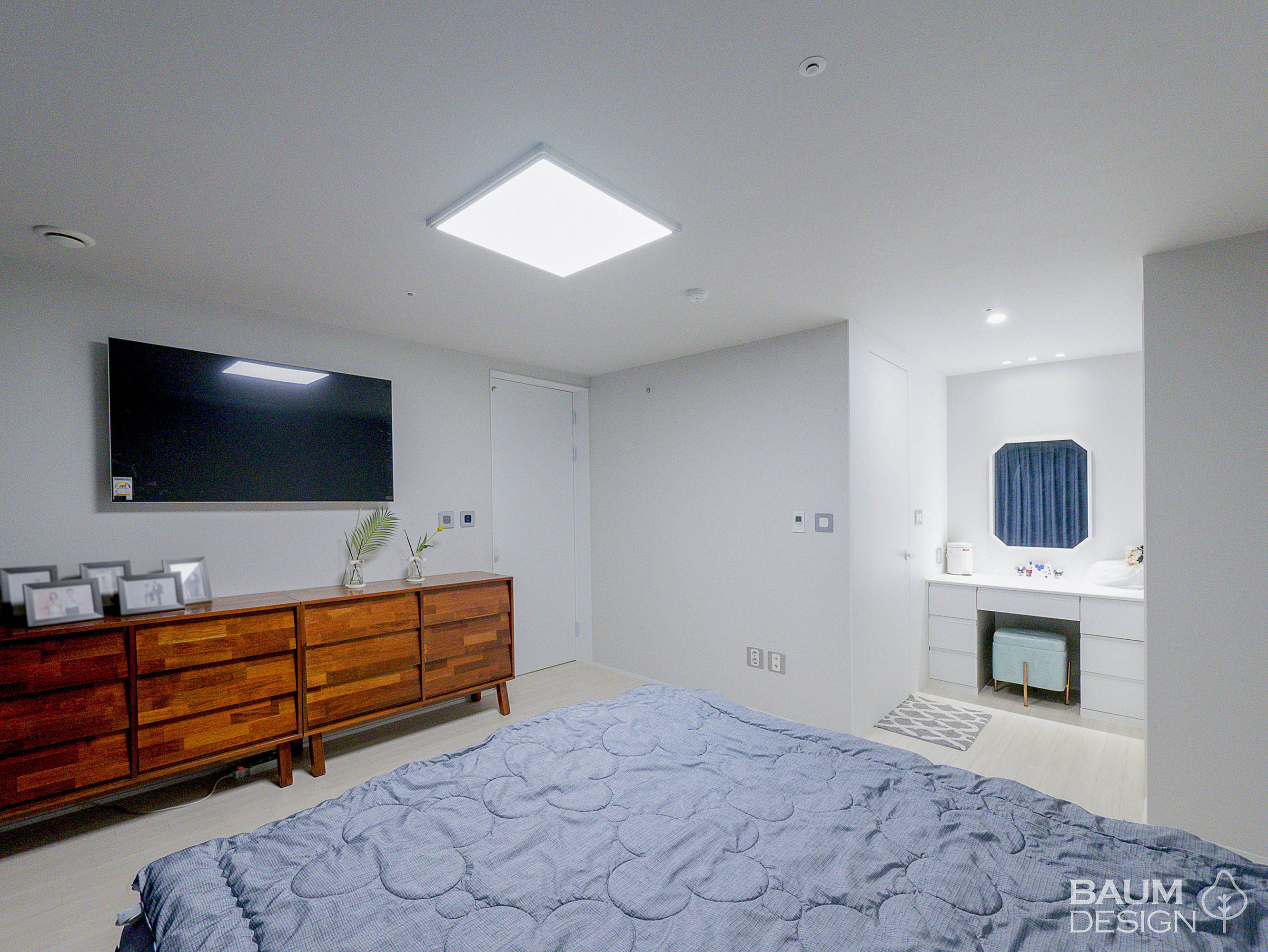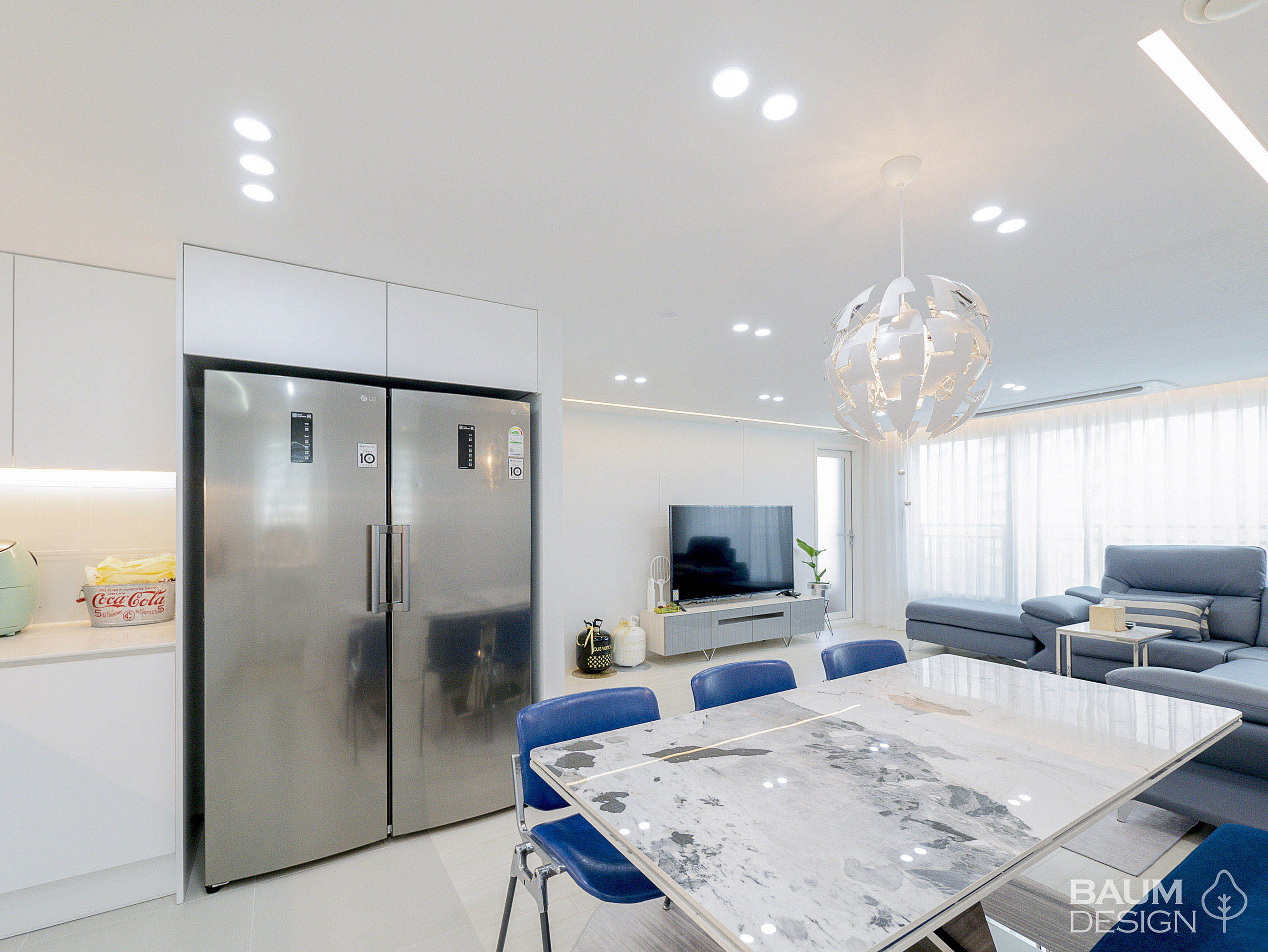 화이트에 블루로 포인트를 준 시원한 무몰딩, 히든도어, 라인조명 인테리어