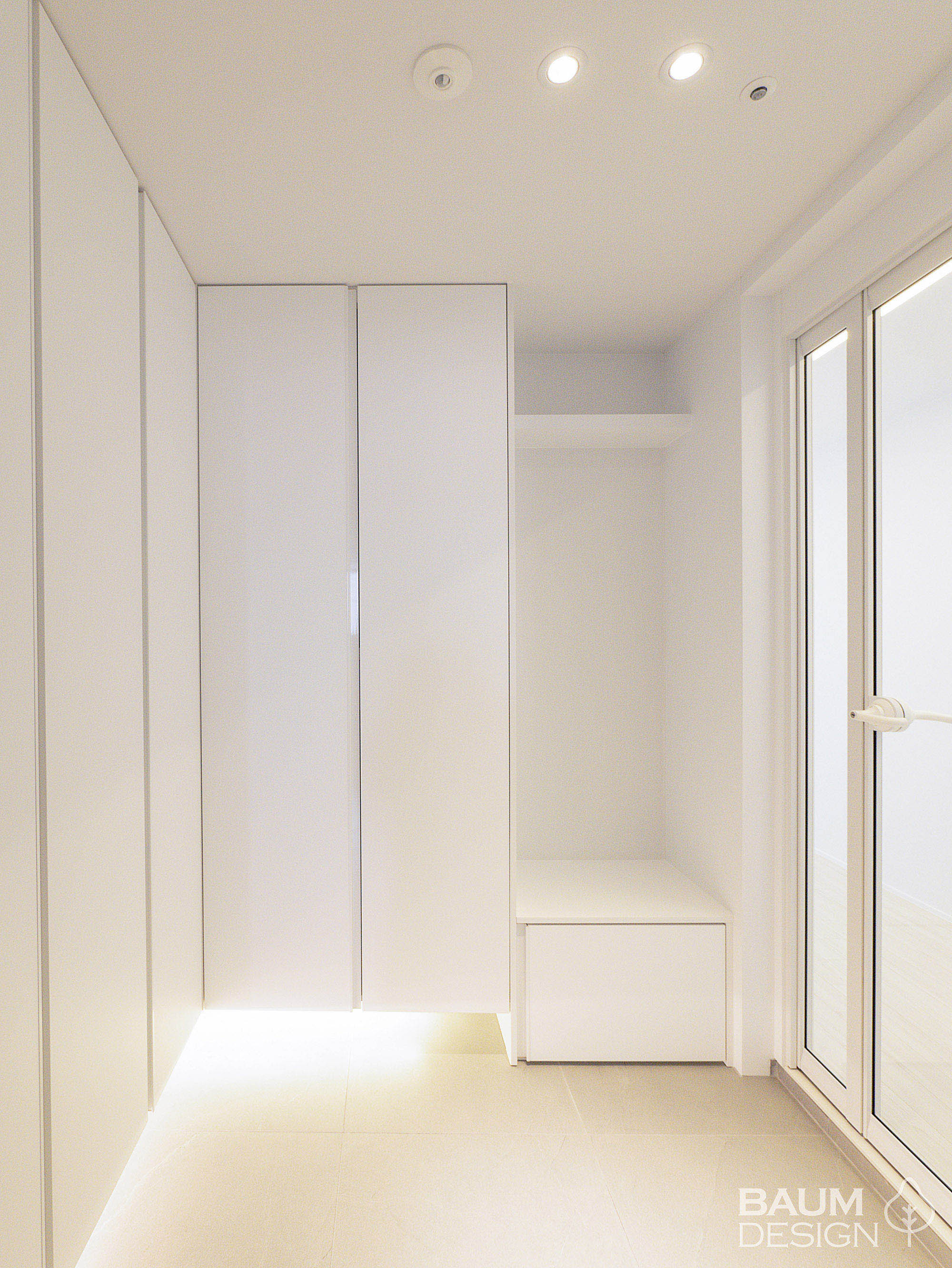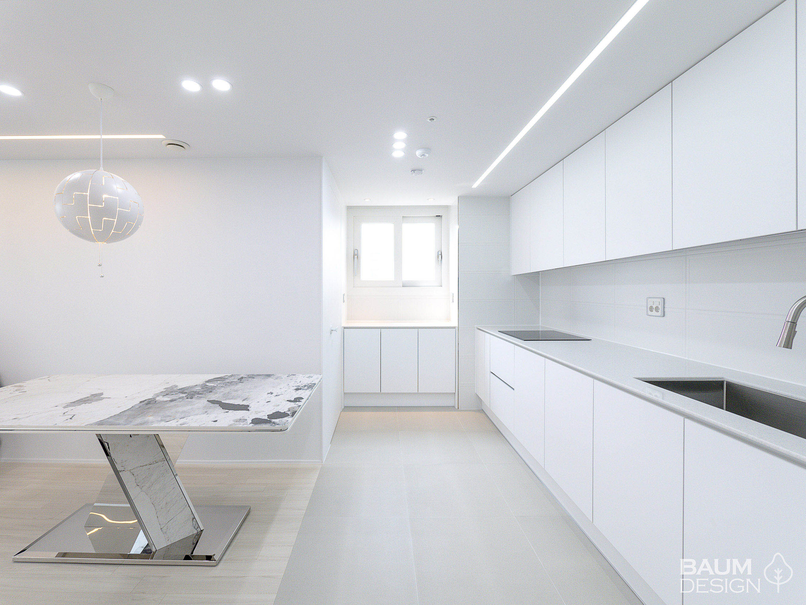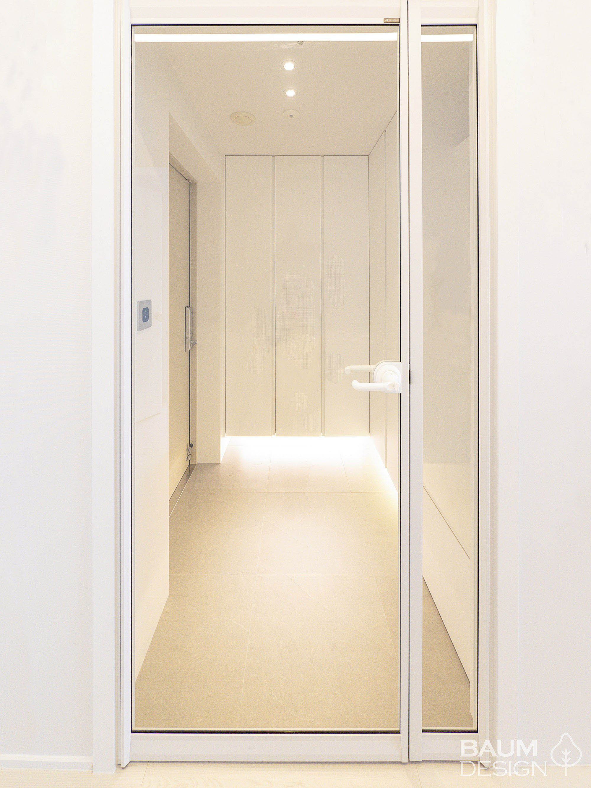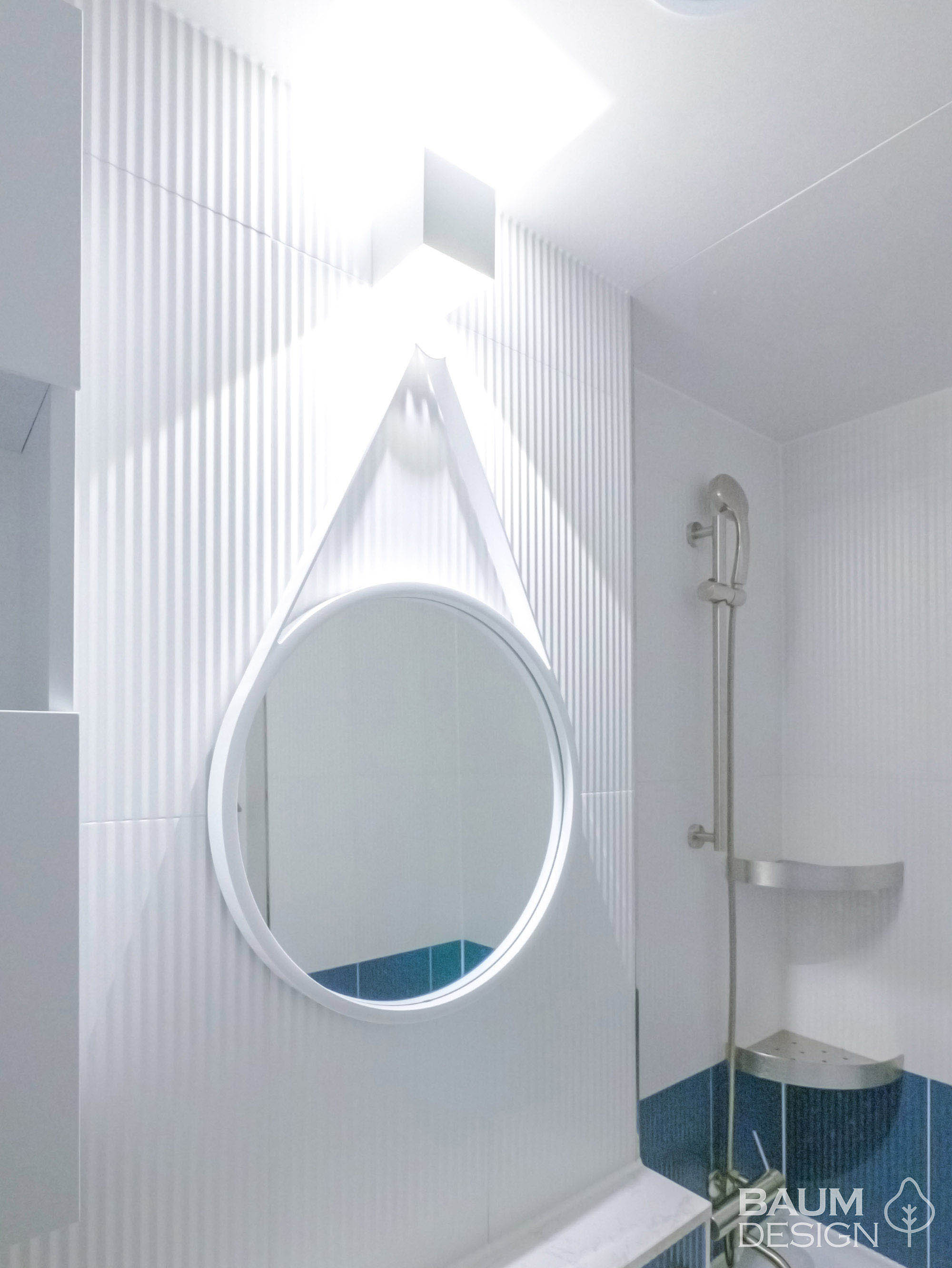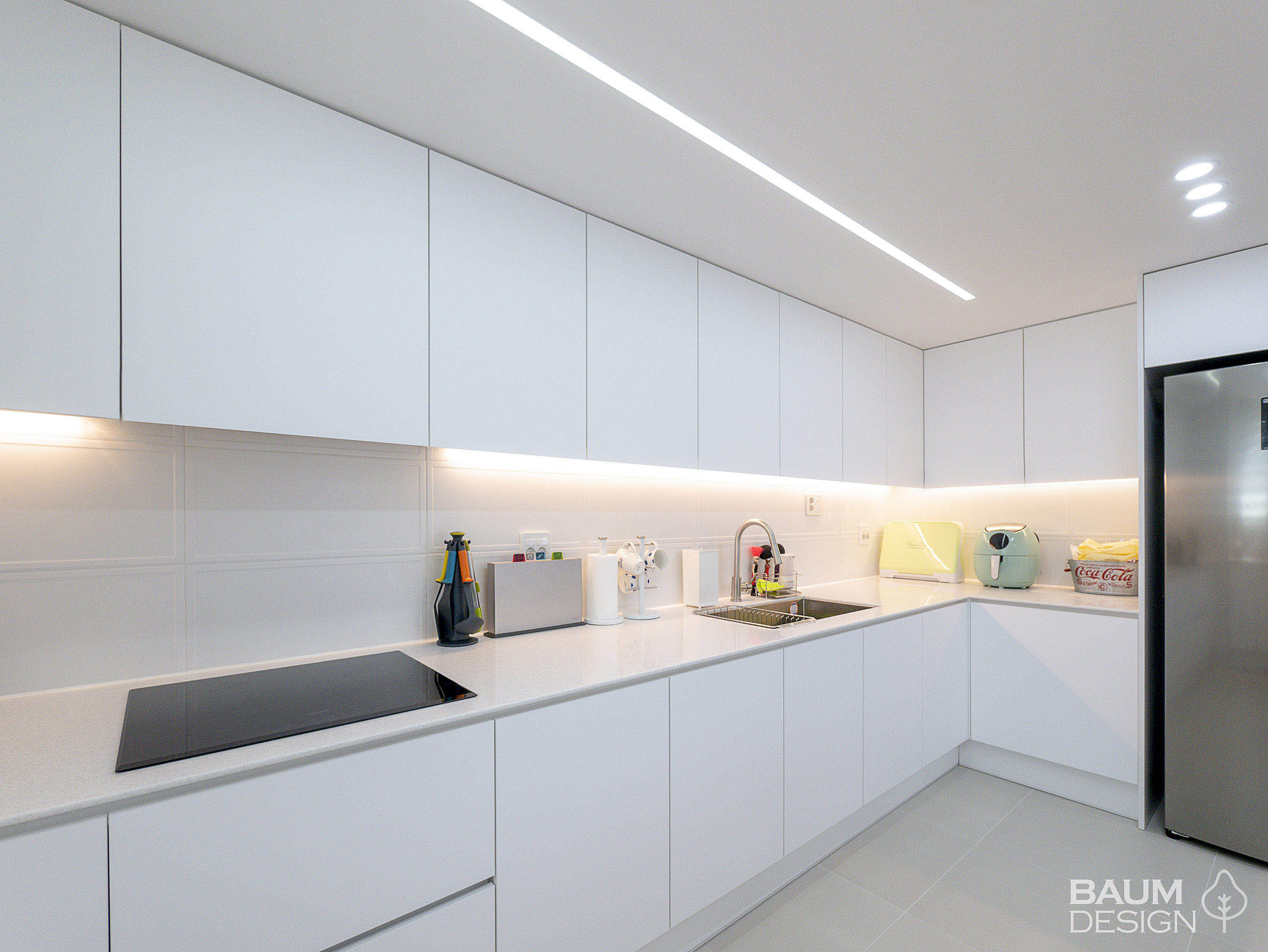 화이트에 블루로 포인트를 준 시원한 무몰딩, 히든도어, 라인조명 인테리어