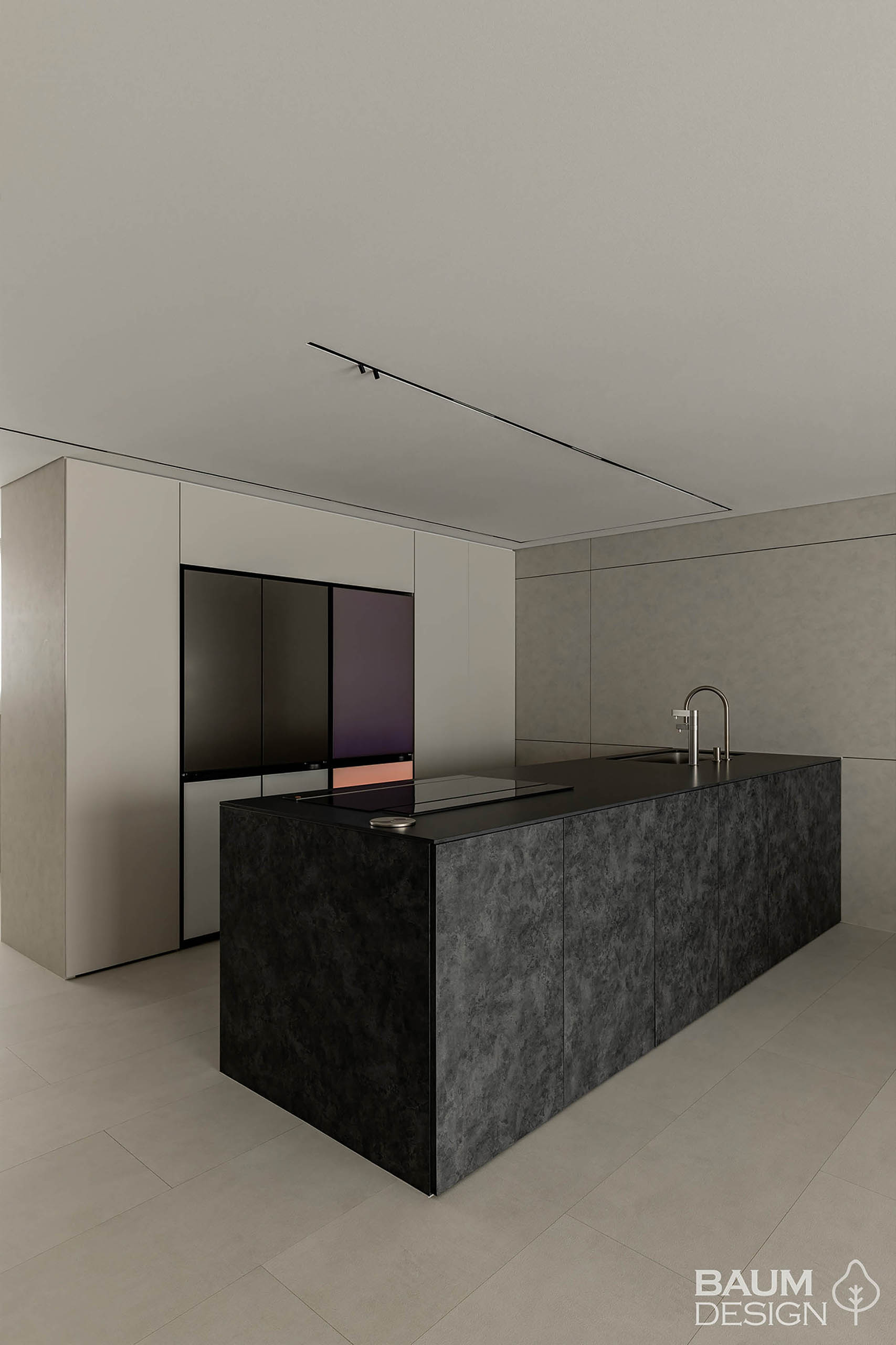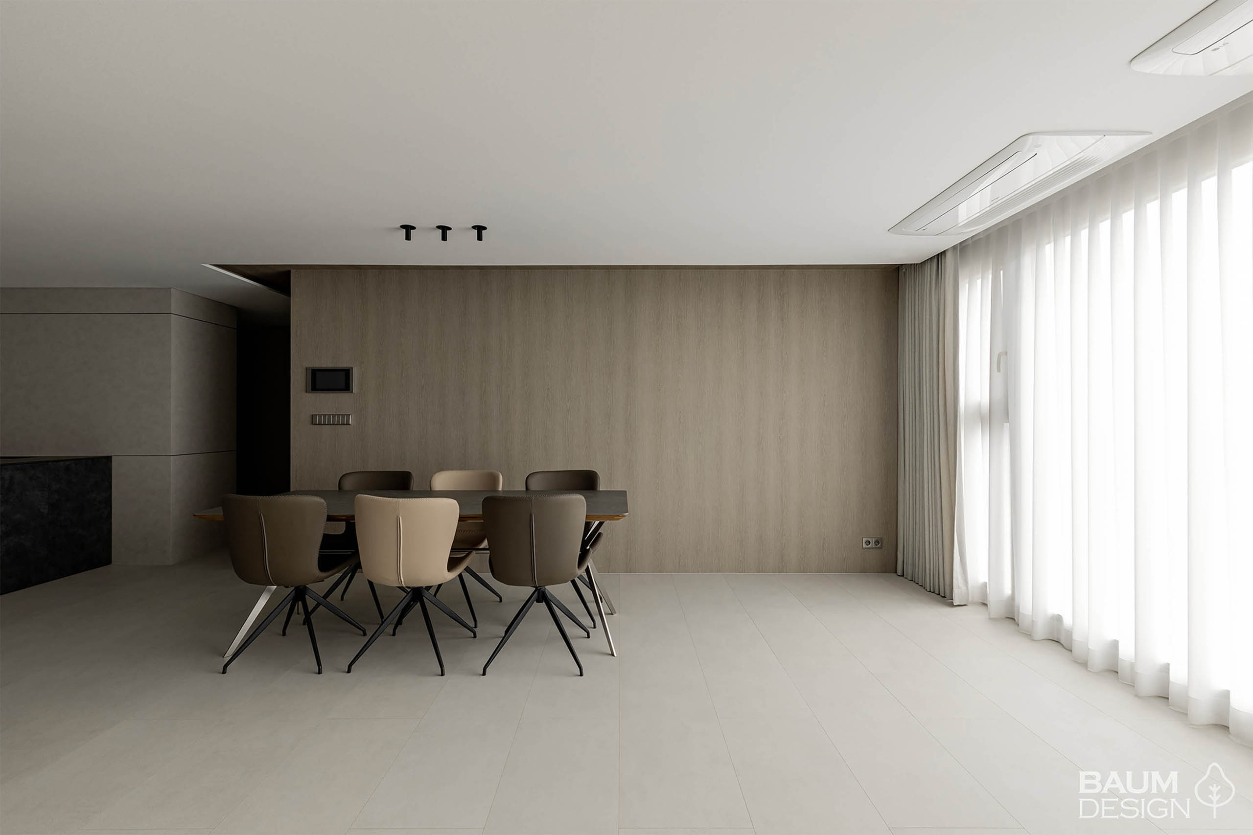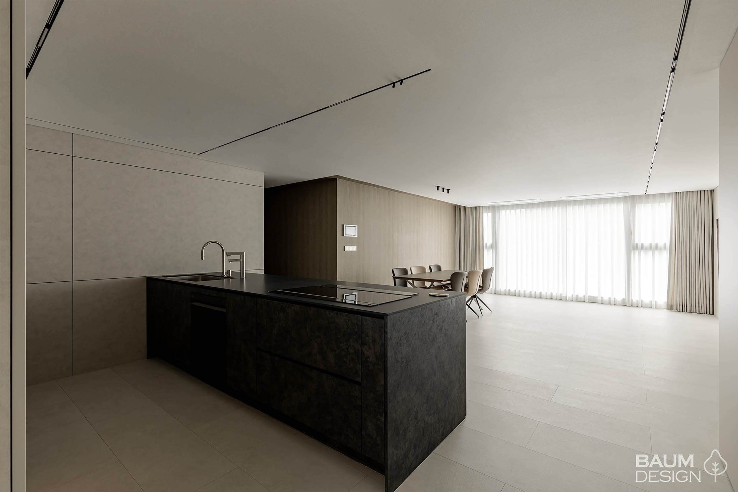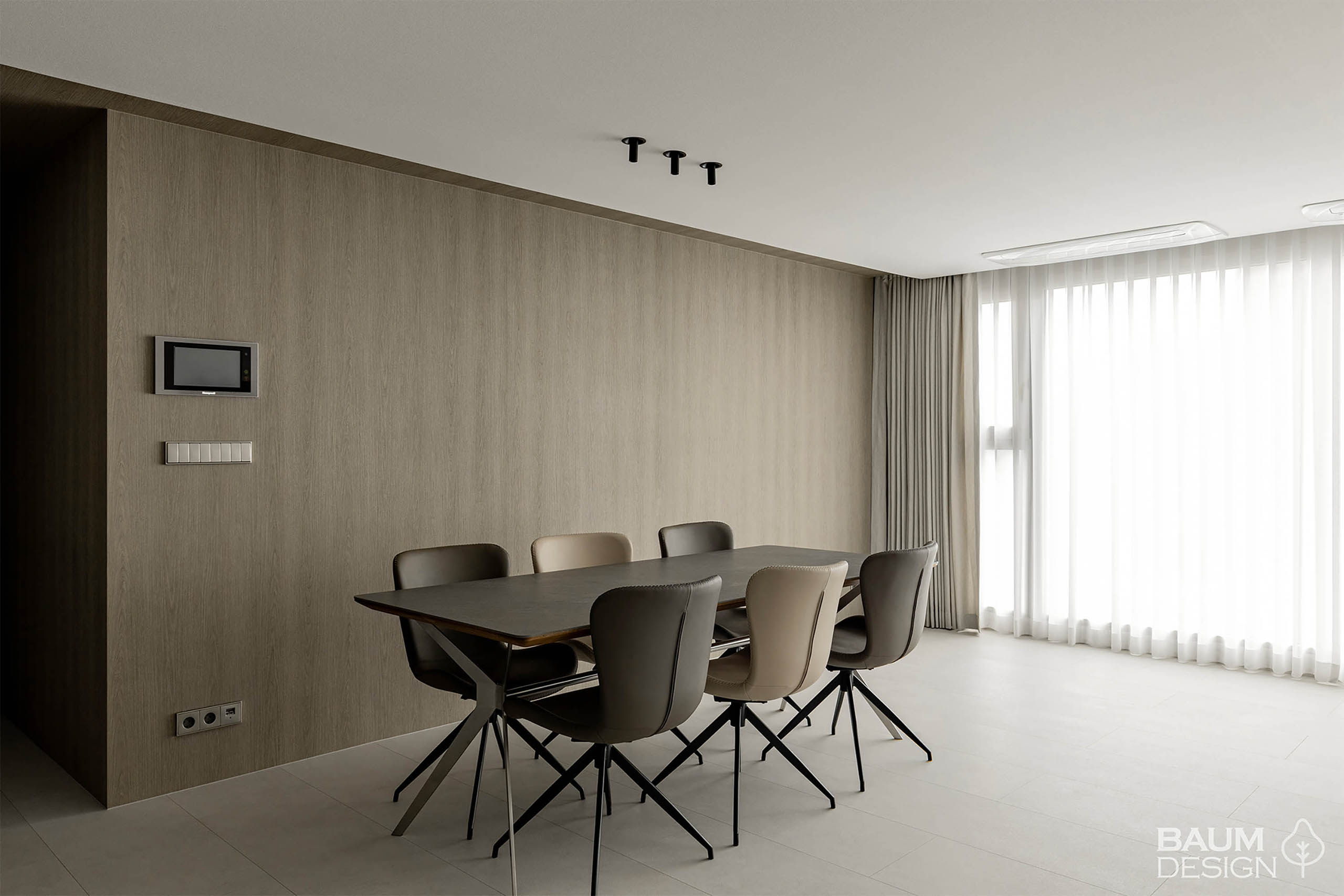 고급스러운 재질감이 느껴지는 필름으로 마감한 거실 벽면과 블랙 세라믹의 아일랜드가 돋보이는 인테리어