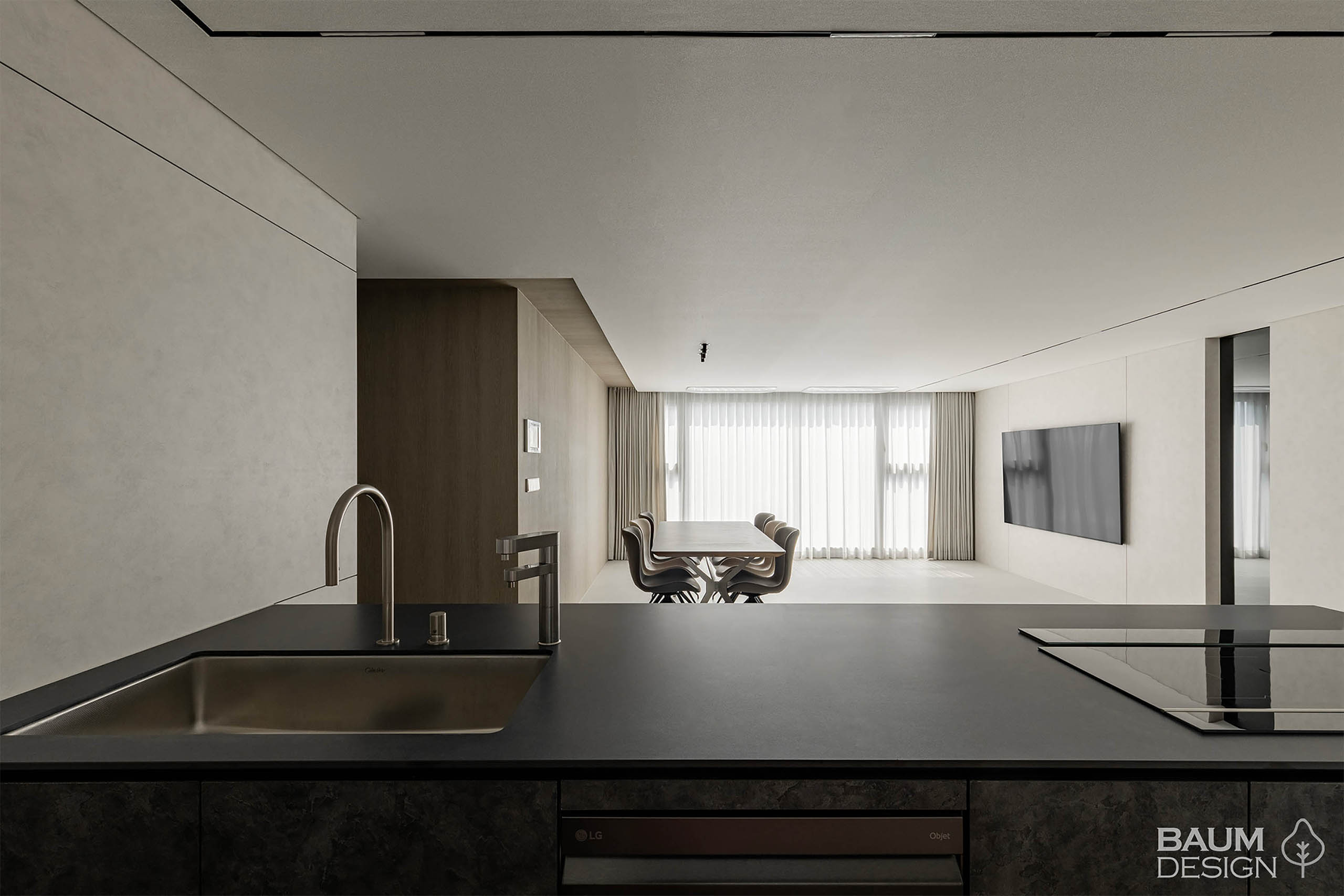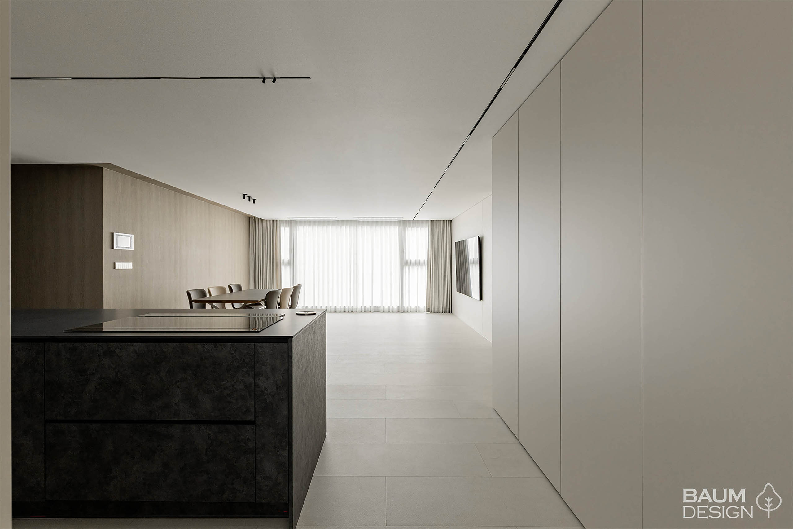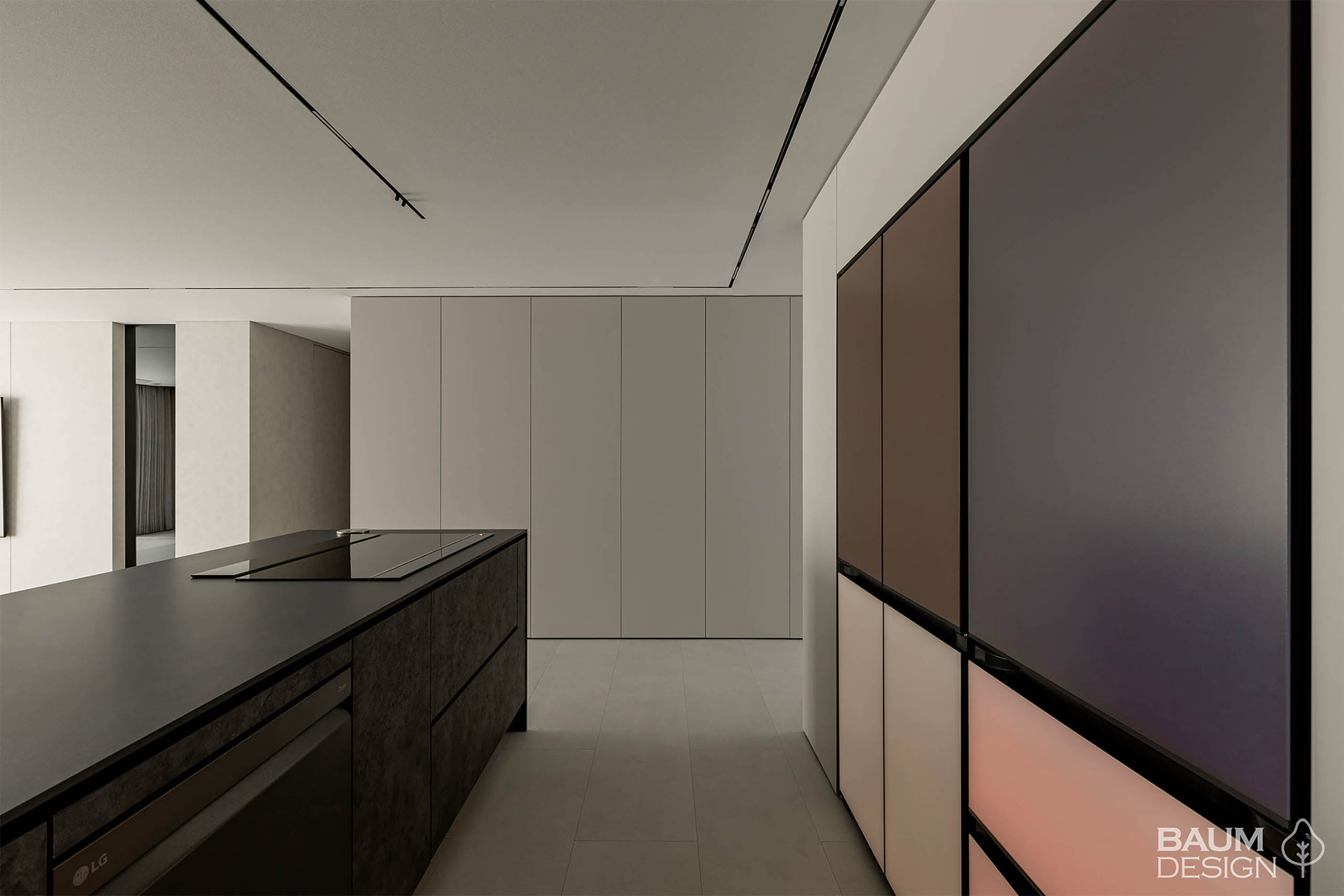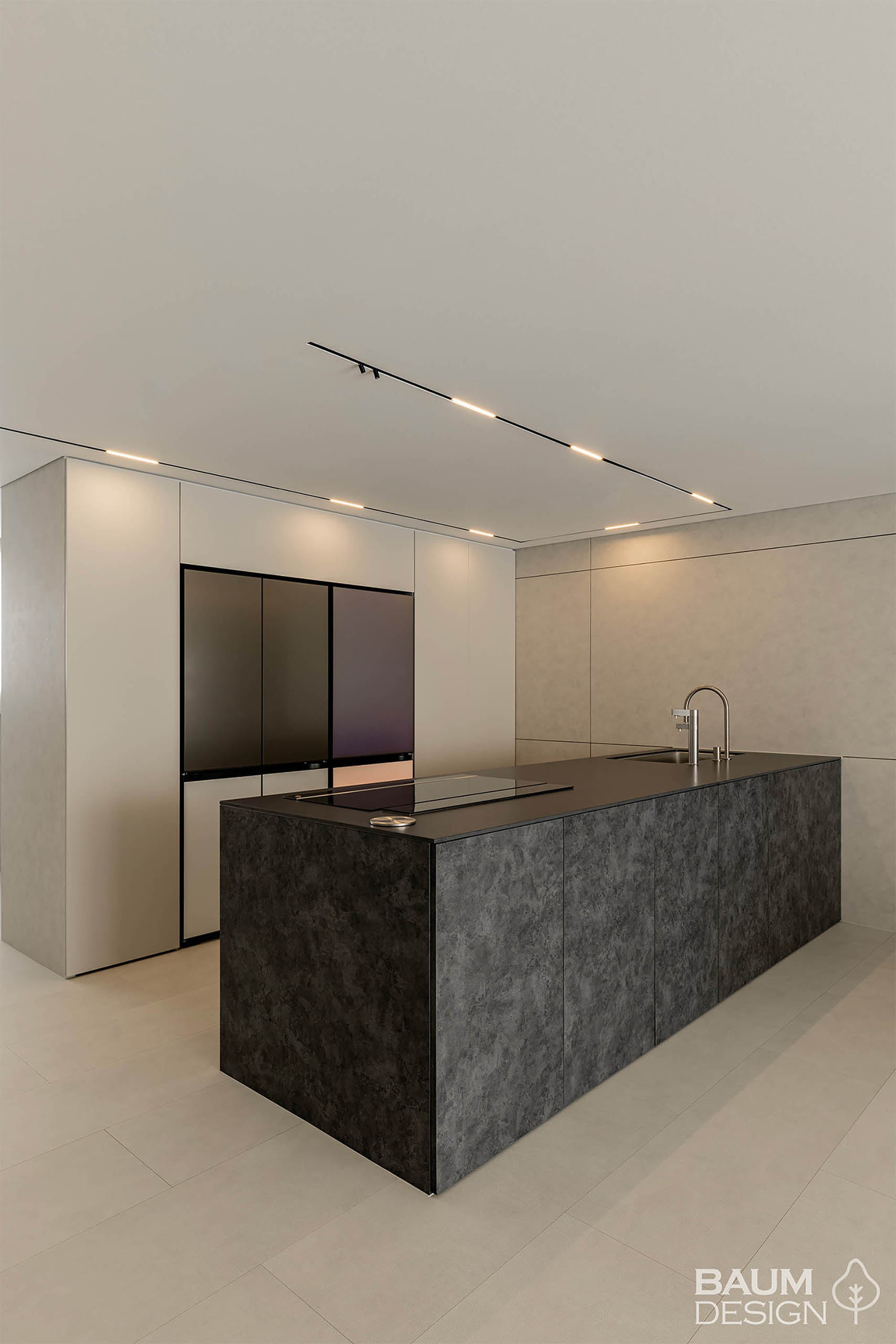 고급스러운 재질감이 느껴지는 필름으로 마감한 거실 벽면과 블랙 세라믹의 아일랜드가 돋보이는 인테리어
