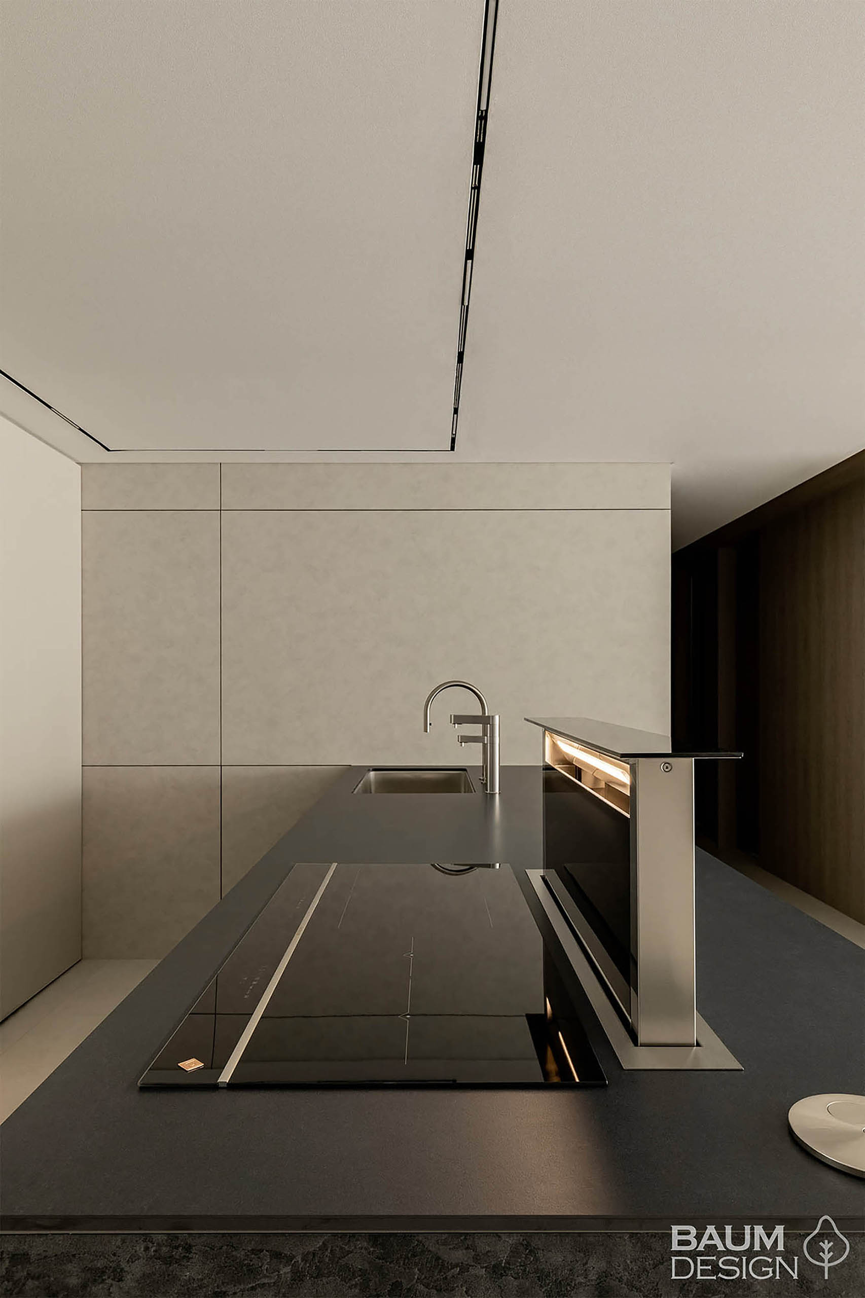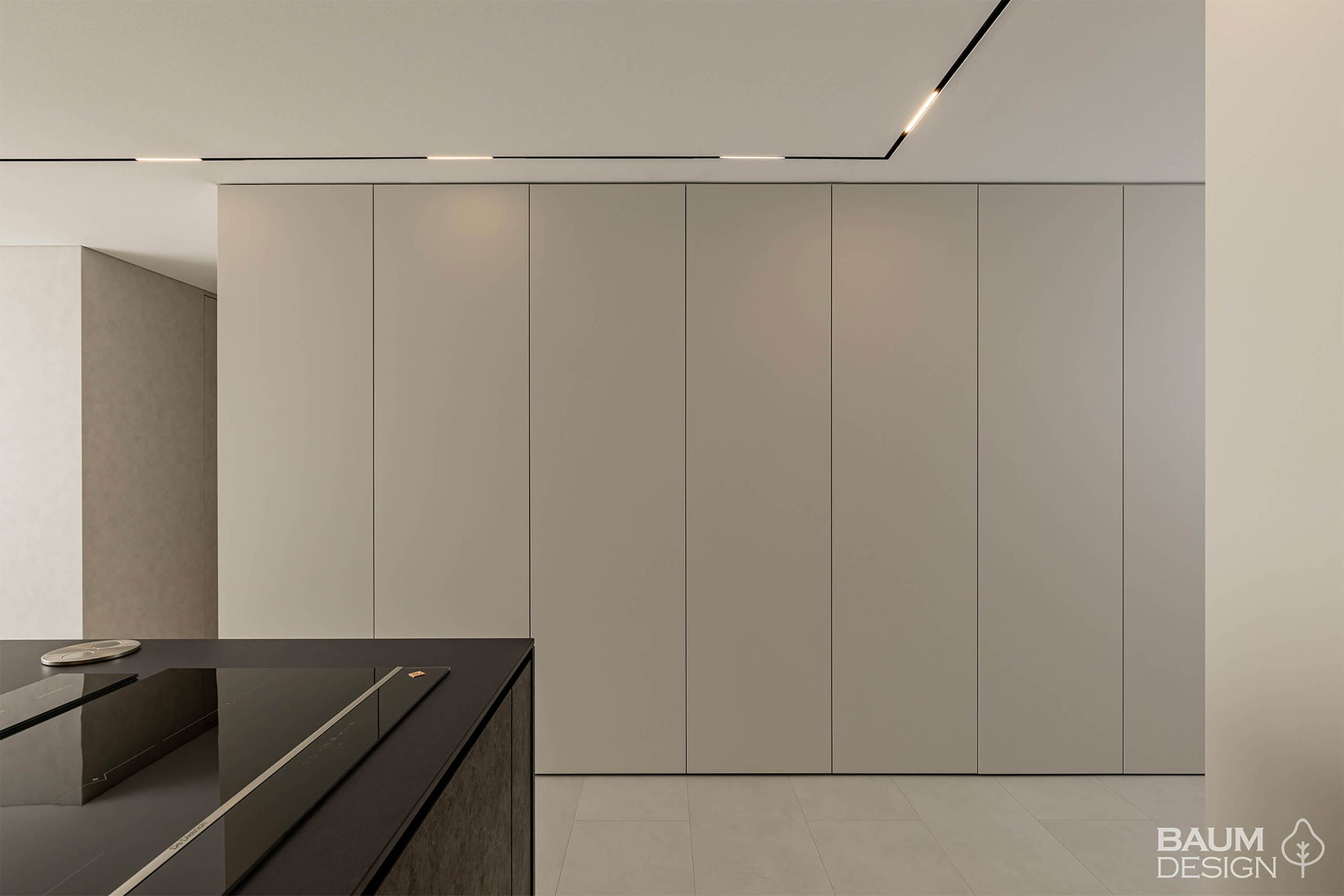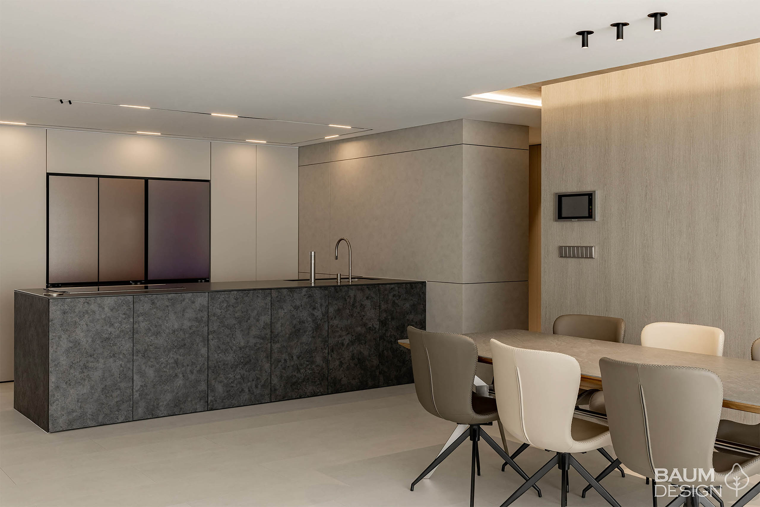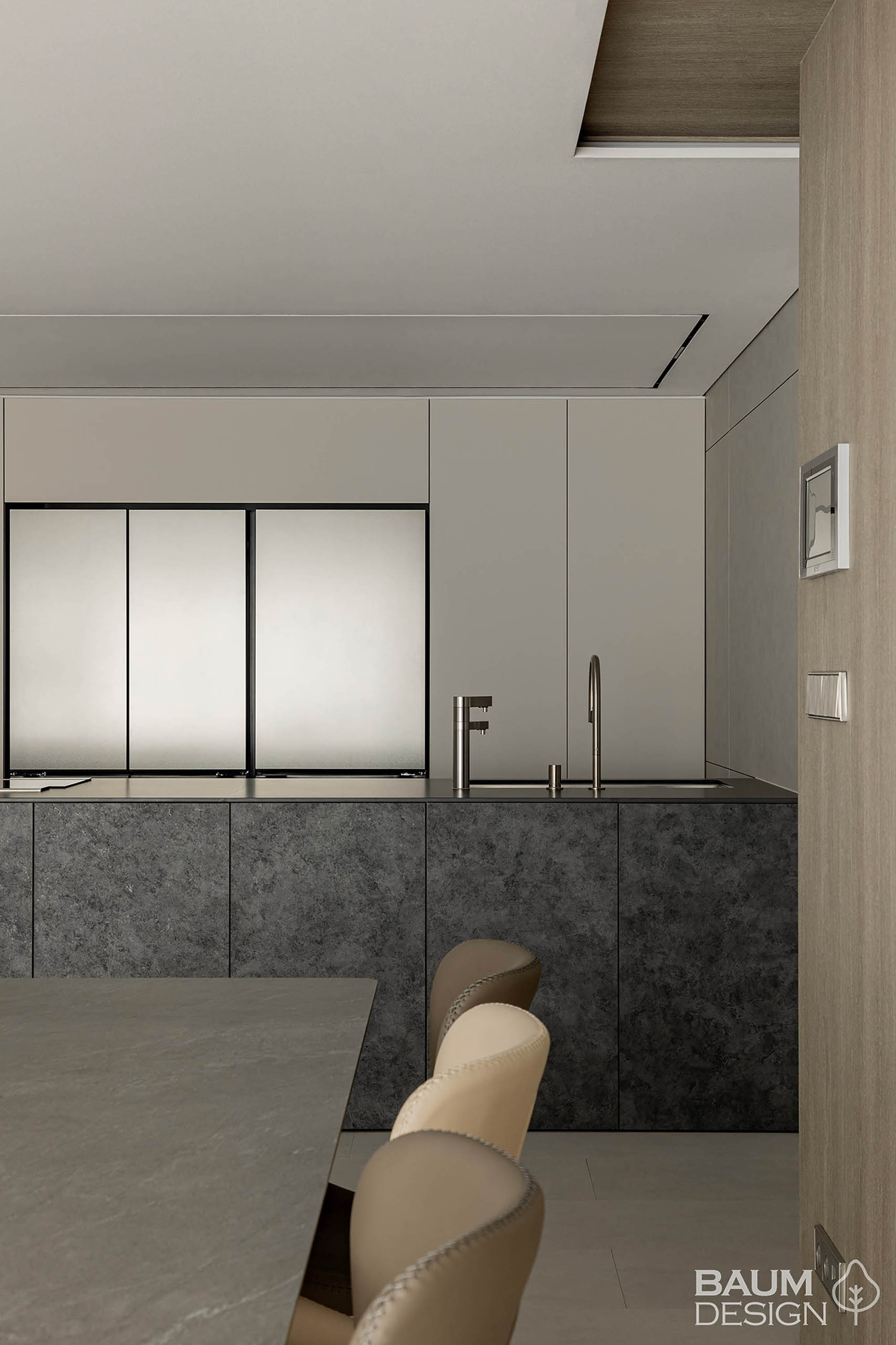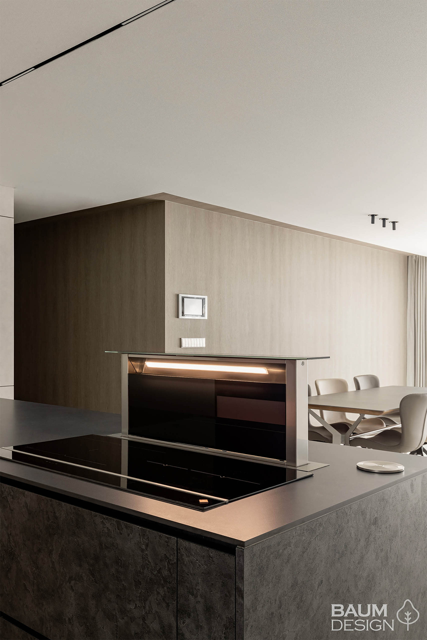 고급스러운 재질감이 느껴지는 필름으로 마감한 거실 벽면과 블랙 세라믹의 아일랜드가 돋보이는 인테리어
