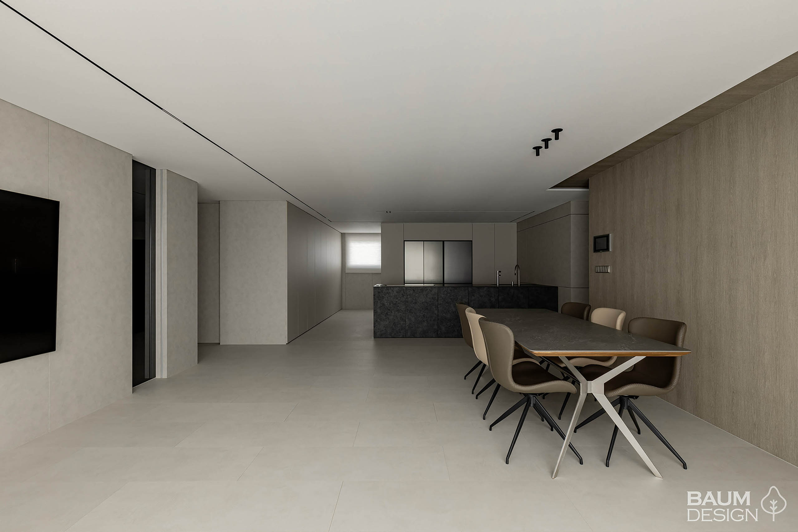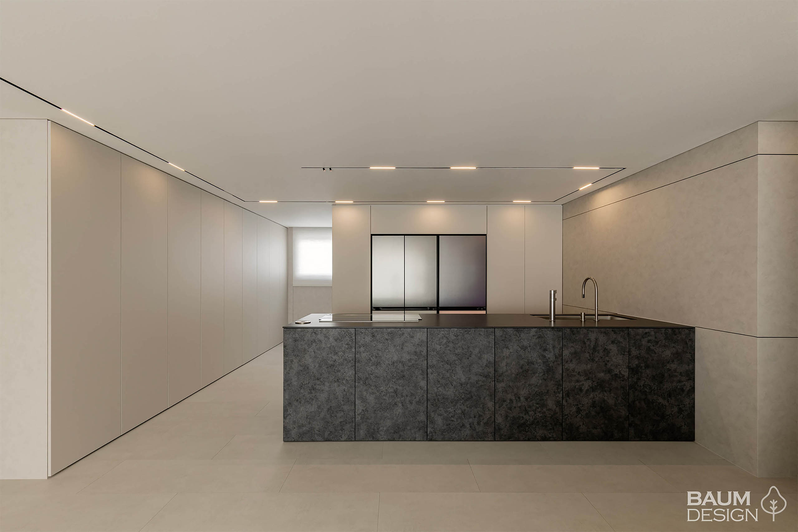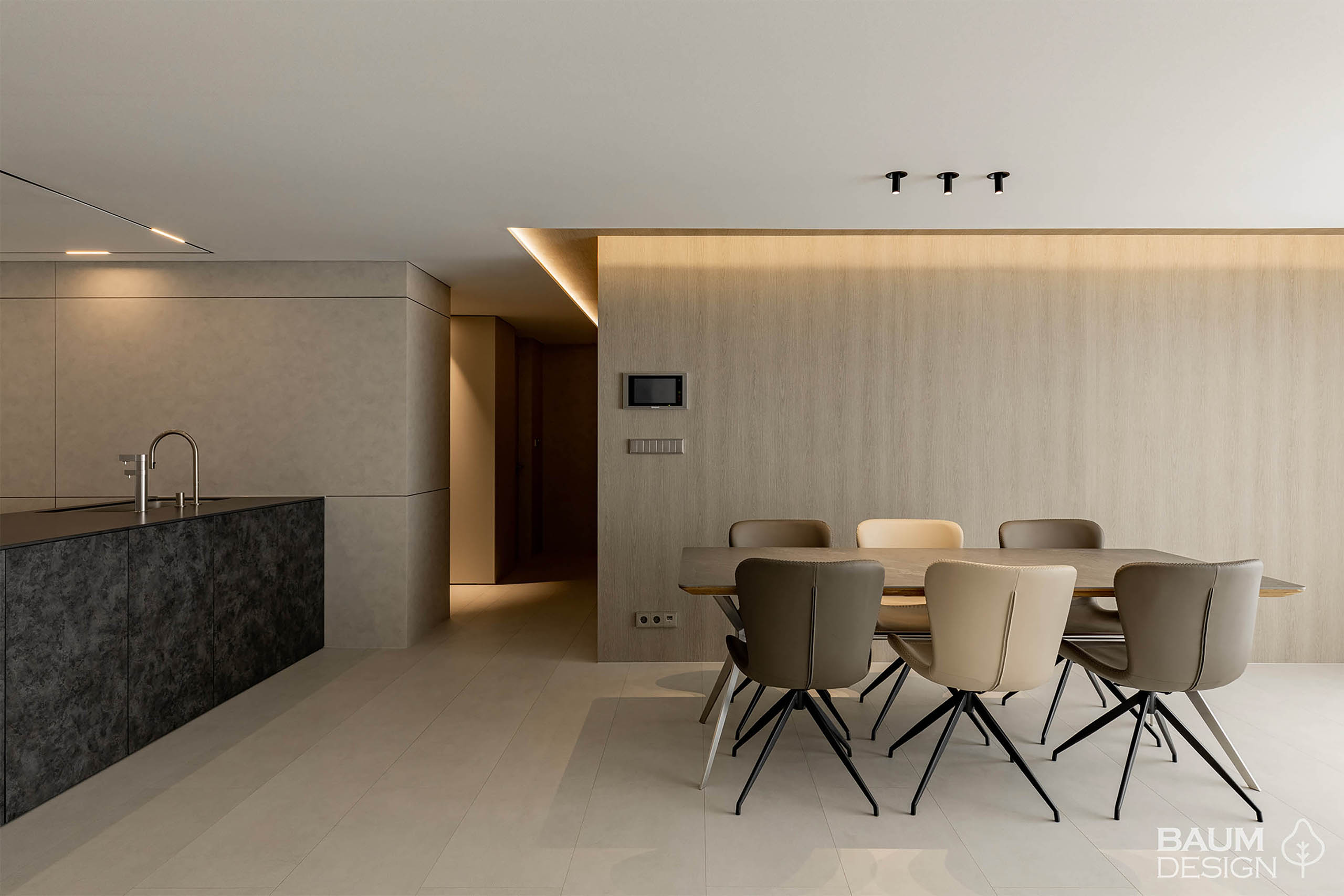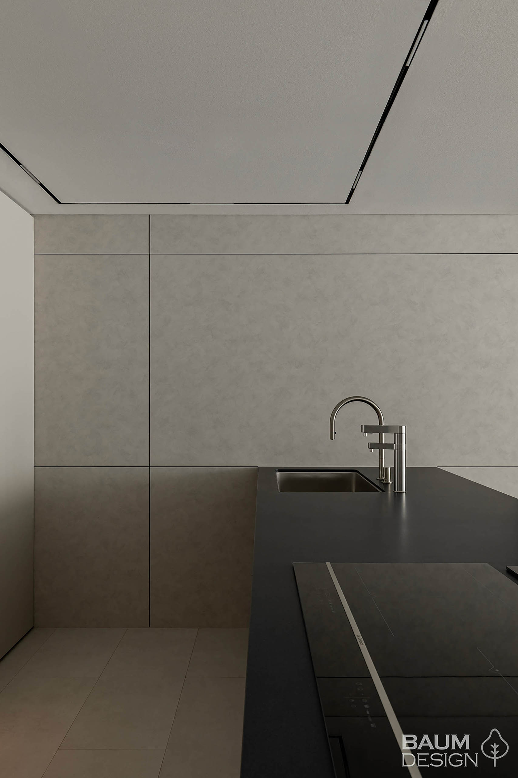 고급스러운 재질감이 느껴지는 필름으로 마감한 거실 벽면과 블랙 세라믹의 아일랜드가 돋보이는 인테리어