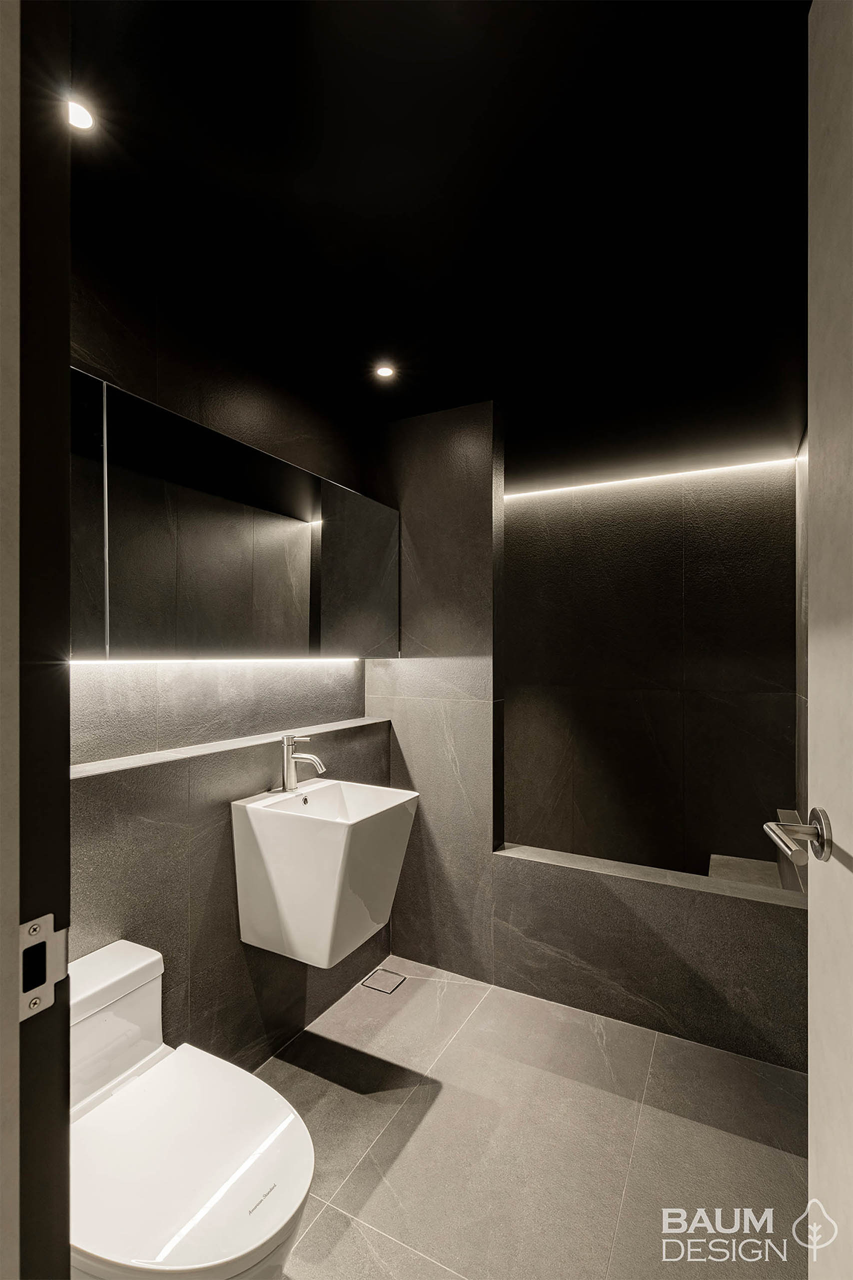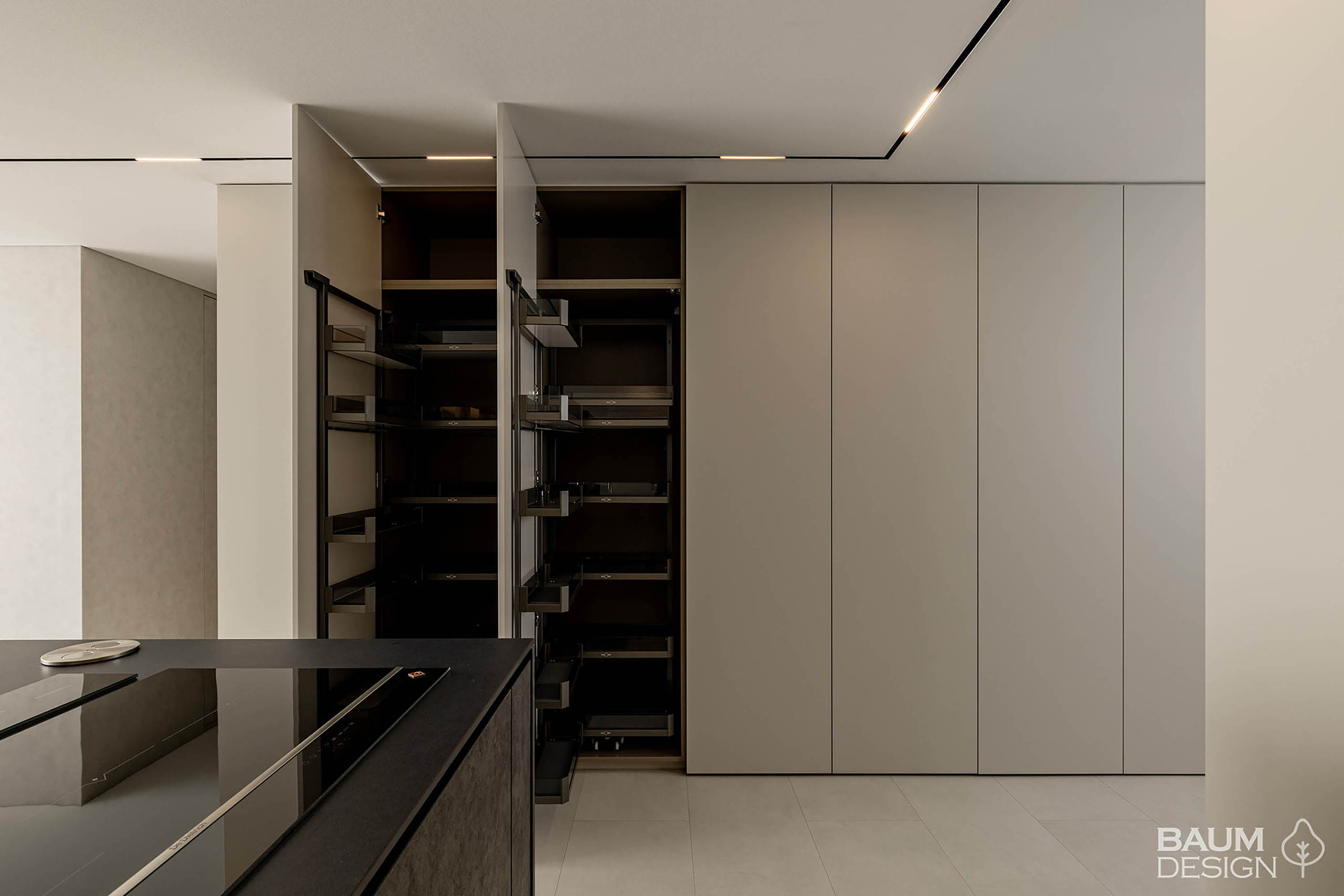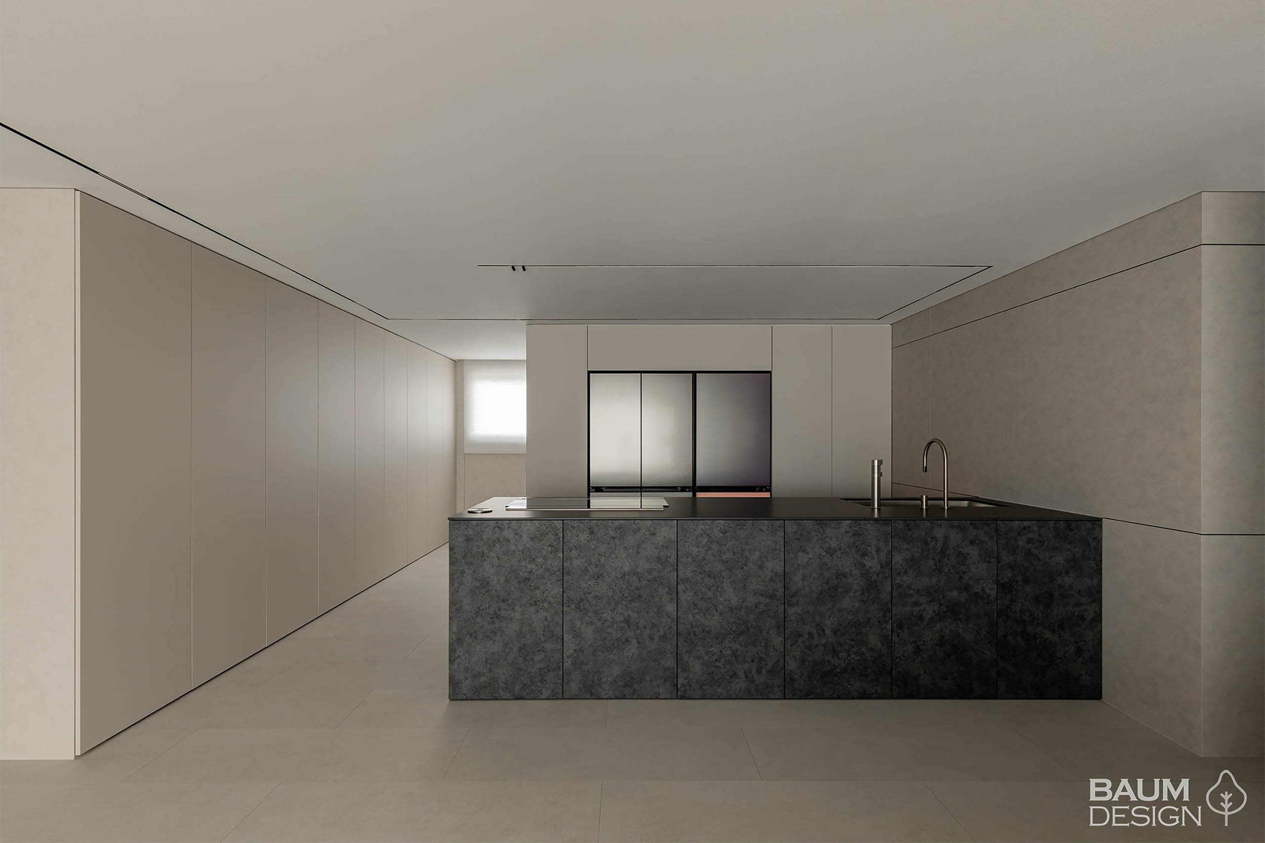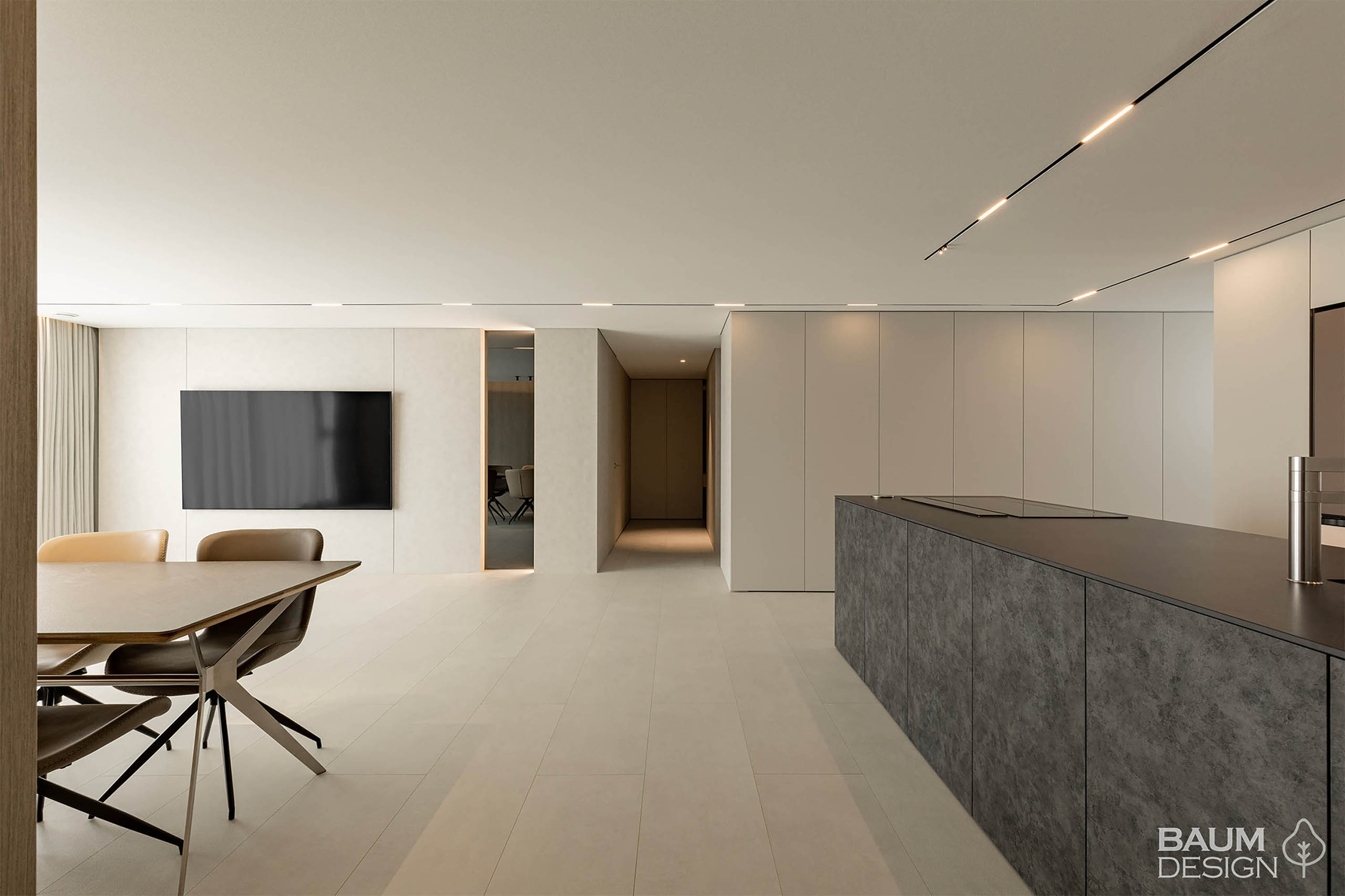 고급스러운 재질감이 느껴지는 필름으로 마감한 거실 벽면과 블랙 세라믹의 아일랜드가 돋보이는 인테리어